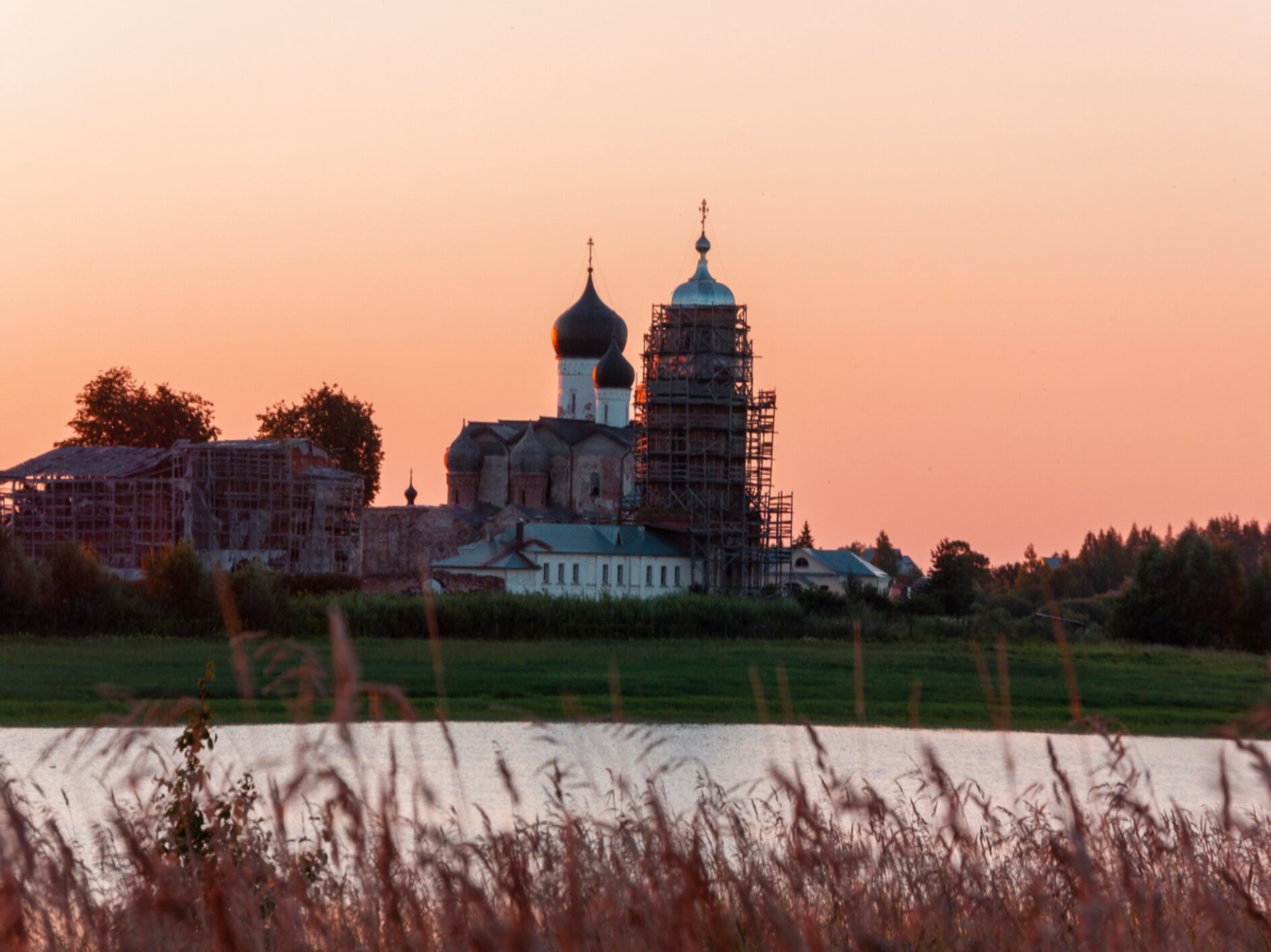 На переднем плане фотографии виден один из монастырских храмов, находящийся под реставрацией, о чём свидетельствуют установленные строительные леса. Это зримое напоминание о непрестанных трудах по сохранению нашего духовного и культурного наследия. Данная мера направлена на восстановление и укрепление древних стен, дабы сохранить уникальный архитектурный ансамбль монастыря для будущих поколений.