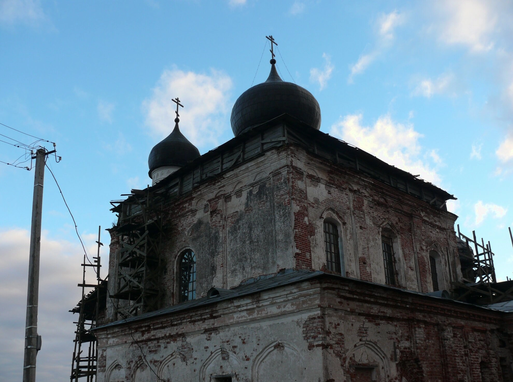Архитектурный ансамбль монастыря начал формироваться в XV веке и в основном сложился к середине XVI столетия. На снимке можно видеть старинный храм, являющийся сердцем обители. Его стены из красного кирпча выдержали испытание веками, а два купола, увенчанные православными крестами, символизируют двух естеств Господа нашего Иисуса Христа. В момент съёмки здание находилось в процессе благоукрашения и реставрации, о чём свидетельствуют установленные строительные леса — знак возрождения былого величия святой обители после decades запустения.