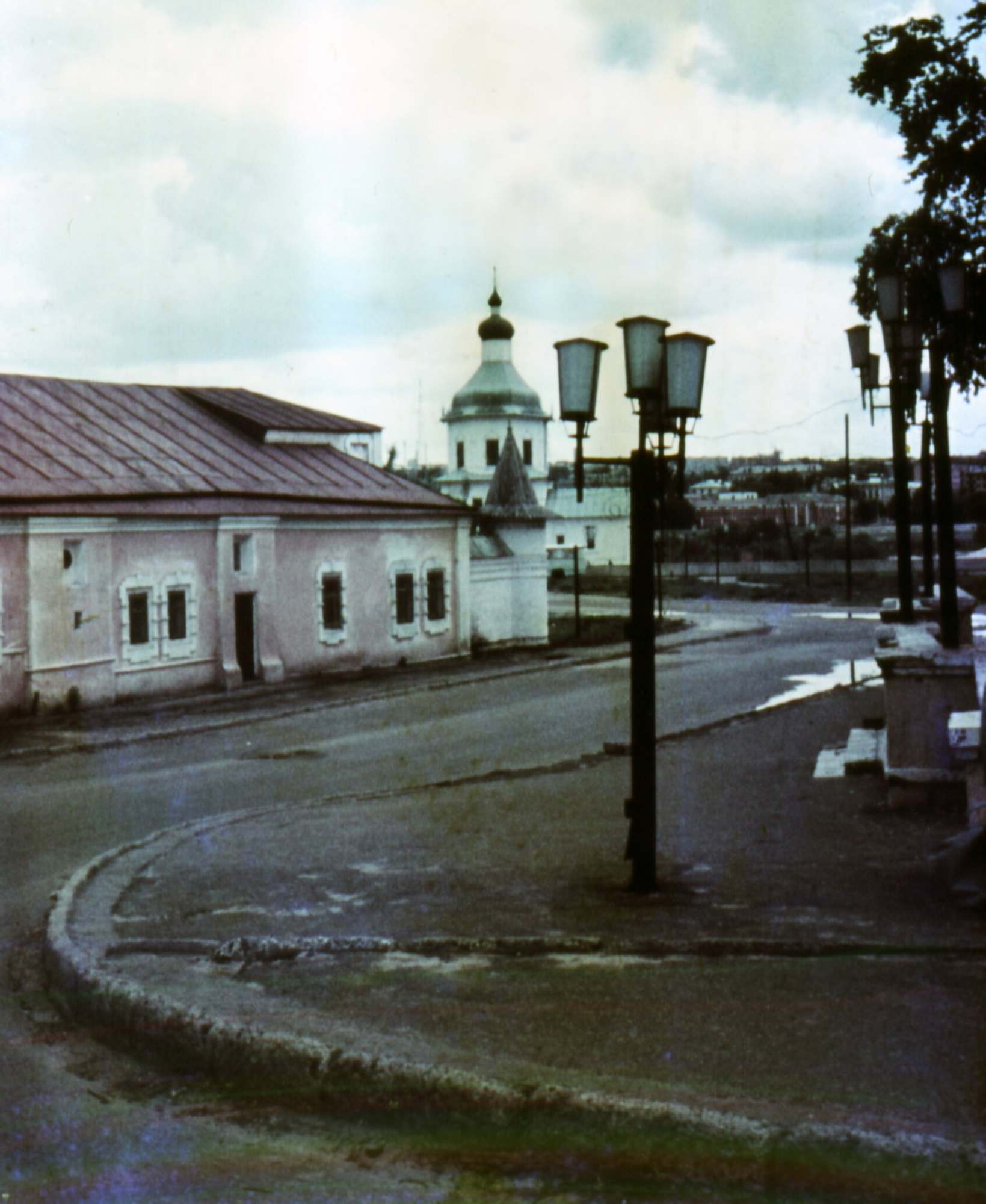 Мокрая булыжная мостовая и тротуар, освещённые мягким светом пасмурного дня, отражают архитектурную красоту православных святынь. Вдоль улицы установлены старинные фонарные столбы с несколькими плафонами, что придает снимку особый колорит и атмосферу старины. Зелёные насаждения справа и открывающийся городской пейзаж на заднем плане завершают гармоничную картину.
