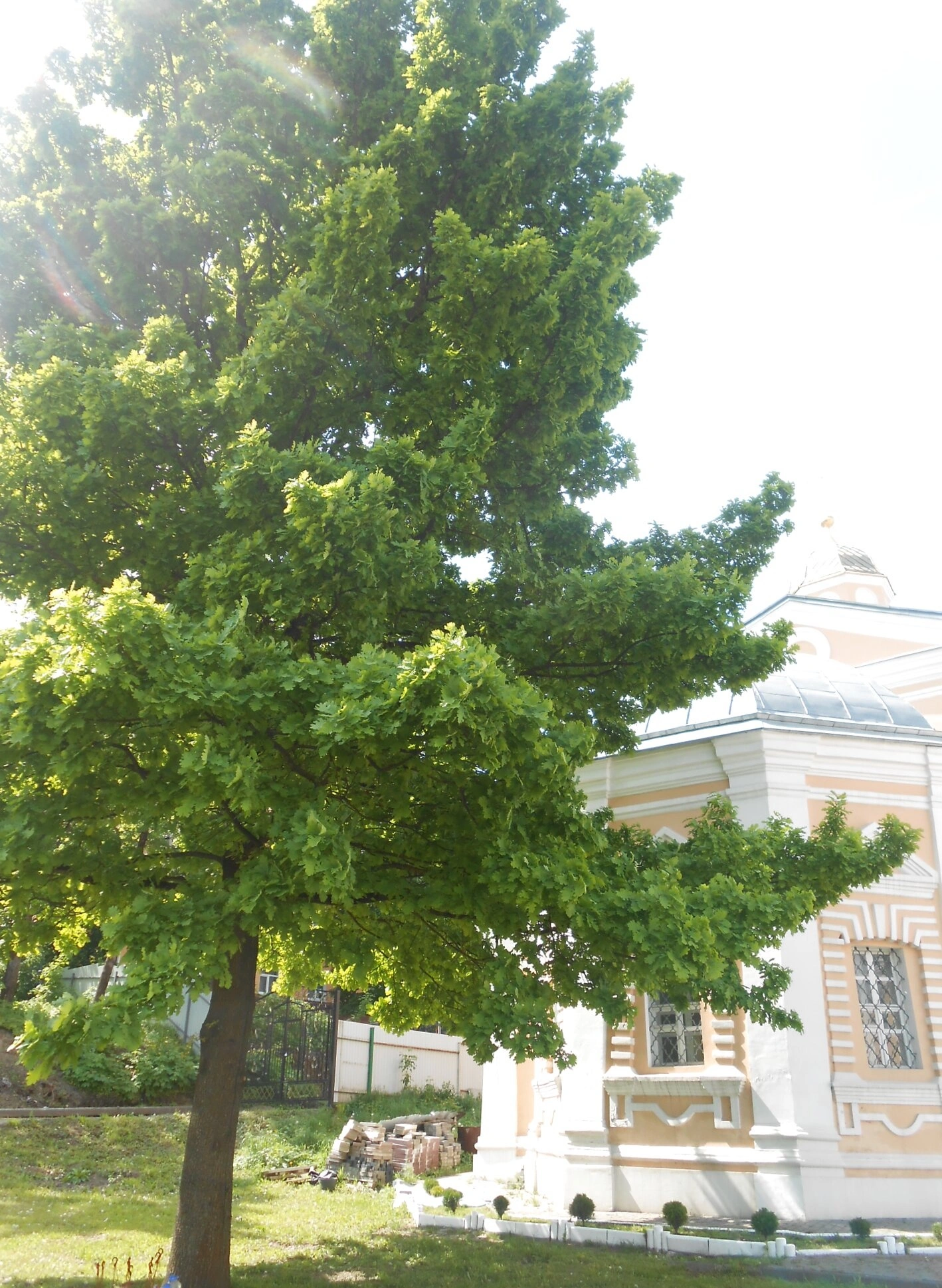 На переднем плане фотографии виднеется пышная крона дерева, обрамляющая святыню и придающая снимку особую живописность. Справа от основного здания просматривается еще один купол храмового комплекса, свидетельствующий о масштабах монастырской архитектуры. За оградой обители угадываются轮廓ы других построек, составляющих единый ансамбль.