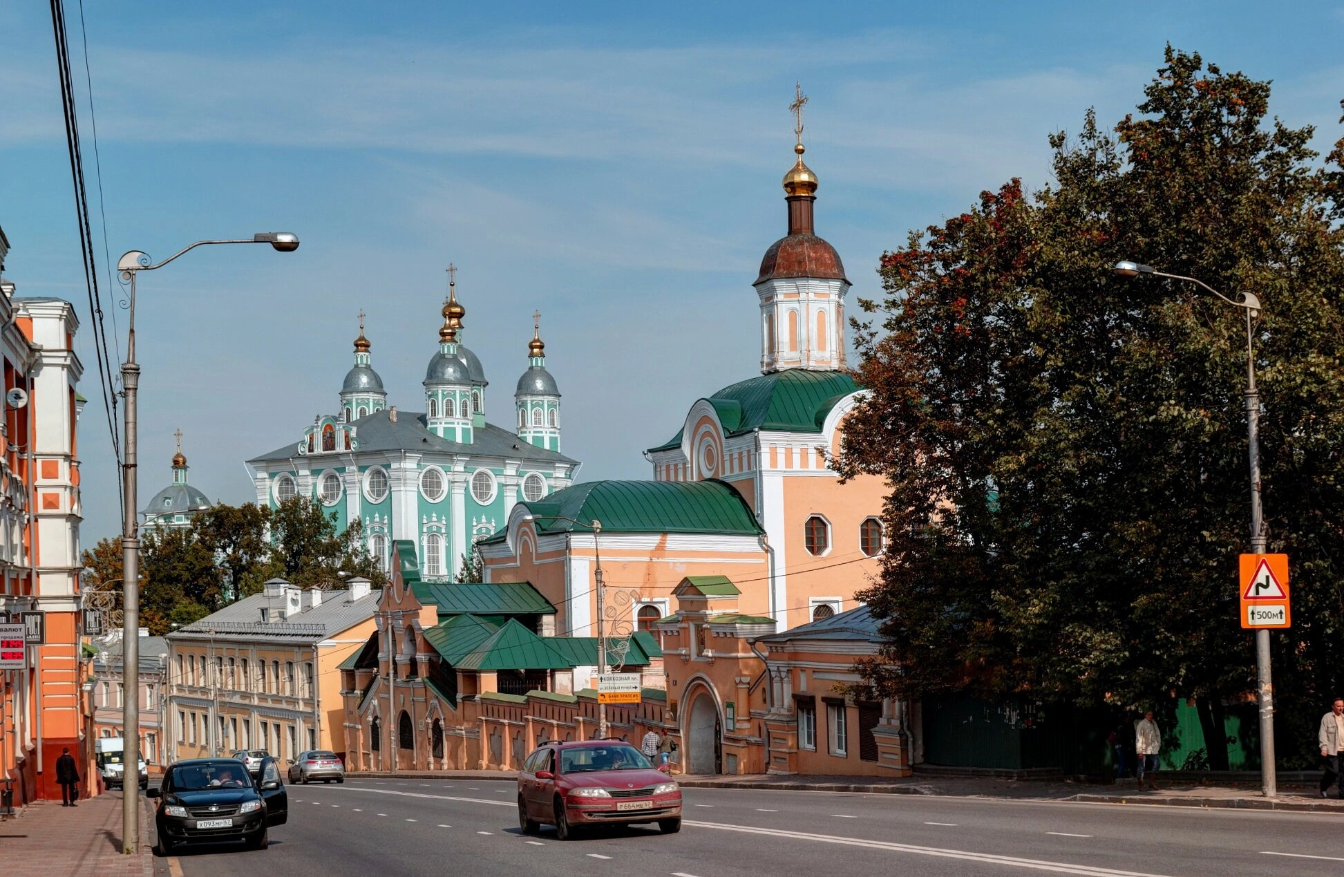 На представленной фотографии запечатлен величественный ансамбль Свято-Троицкого монастыря в Смоленске, расположенный на исторической Большой Советской улице. Монастырь, являющийся памятником истории федерального значения, предстает перед зрителем во всём своем духовном величии и архитектурной гармонии.
