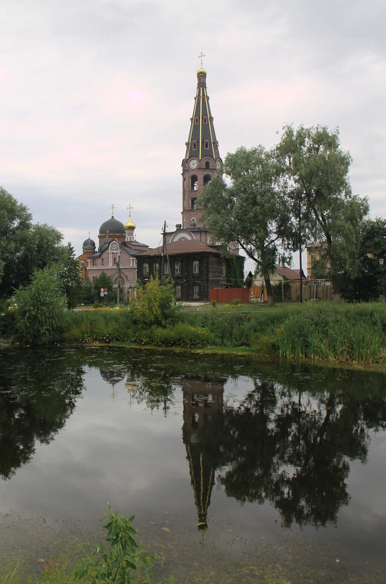 На представленной фотографии запечатлён величественный вид Свято-Троицкого мужского монастыря, расположенного в городе Алатырь Чувашской Республики. Монастырский комплекс, один из старейших в Поволжье, основанный в XVI веке по указу царя Ивана Грозного, мирно отражается в глади тихого водоёма, создавая образ неземной, горней красоты.