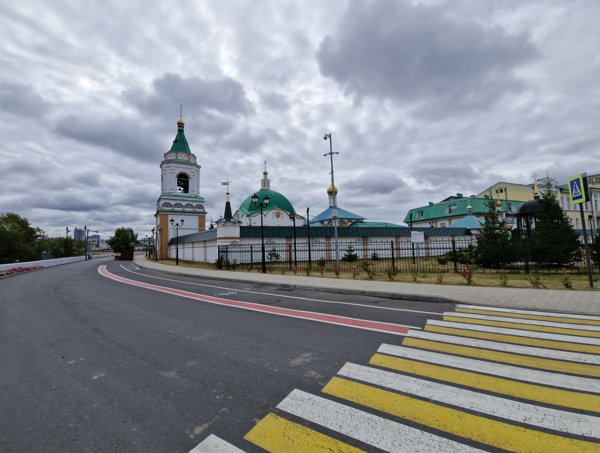 На представленной фотографии запечатлён величественный ансамбль Свято-Троицкого мужского монастыря, расположенного в столице Чувашской Республики — городе Чебоксары. На переднем плане проходит городская дорога, ведущая к святой обители, а справа возвышается сам монастырский комплекс, обнесённый оградой.