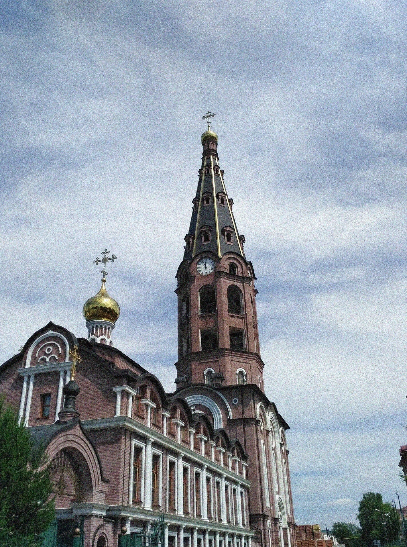На представленной фотографии запечатлён величественный ансамбль Свято-Троицкого мужского монастыря, расположенного в древнем городе Алатыре. Эта православная обитель, основанная в XVI веке по указу царя Ивана Грозного, является одной из старейших и наиболее почитаемых в Среднем Поволжье и на территории современной Чувашии.