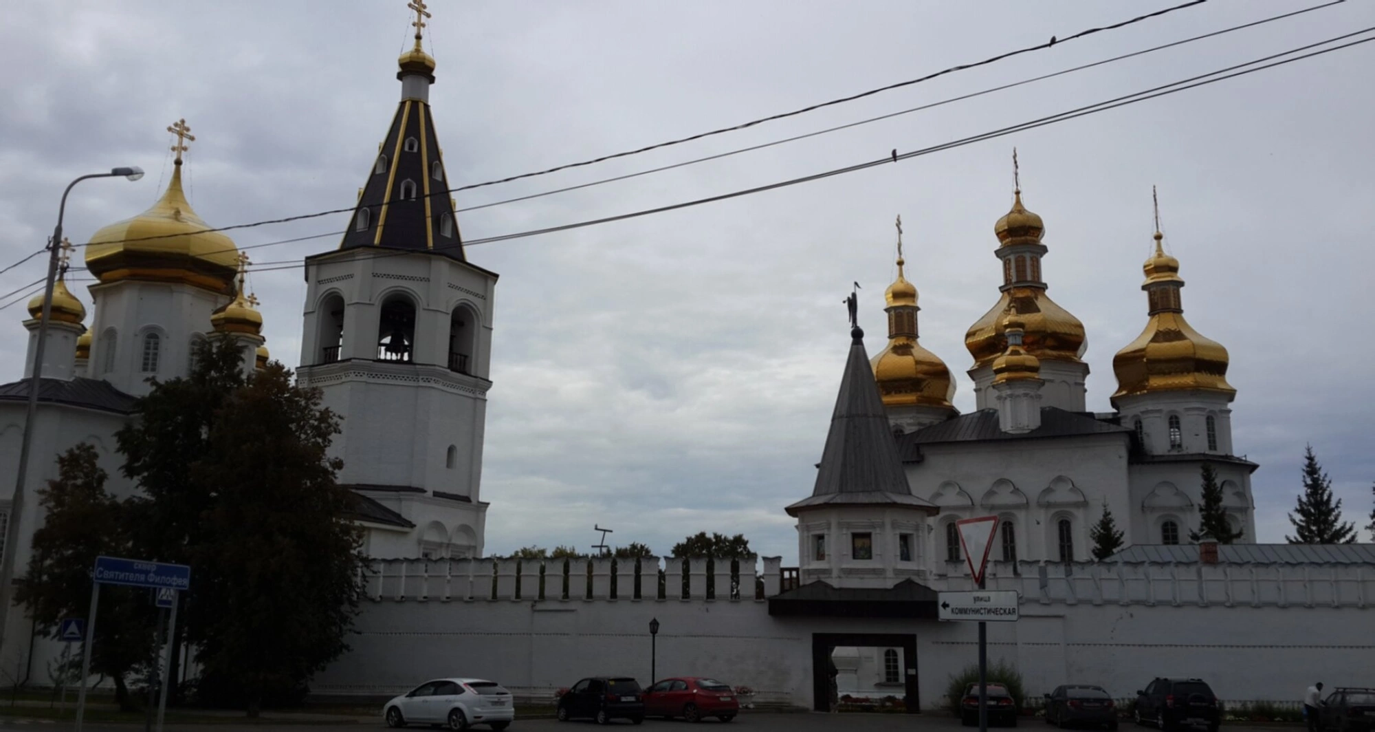 Монастырскую жизнь от суетного мира ограждает мощная каменная стена, придающая обители законченный и неприступный вид. Святые ворота в этой стене являются не только входом в священную обитель, но и символом врат в Царствие Небесное. На переднем плане фотографии видны элементы современного городского пейзажа, что подчёркивает гармоничное соседство древней святыни и динамично развивающегося города Тюмени, демонстрируя неразрывную связь времён и непреходящее значение духовных ценностей.