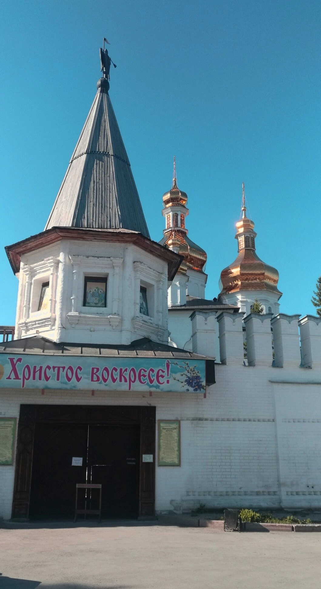 На снимке прекрасно видны белоснежные стены монастырских построек, увенчанные сияющими на солнце златыми куполами, которые символизируют горний мир и устремлённость верующей души к Небесам. Центральное место в композиции занимает баннер с пасхальным приветствием «Христос воскресе!», что свидетельствует о жизни обители в ритме церковного календаря и о непрестанной молитве её насельников.