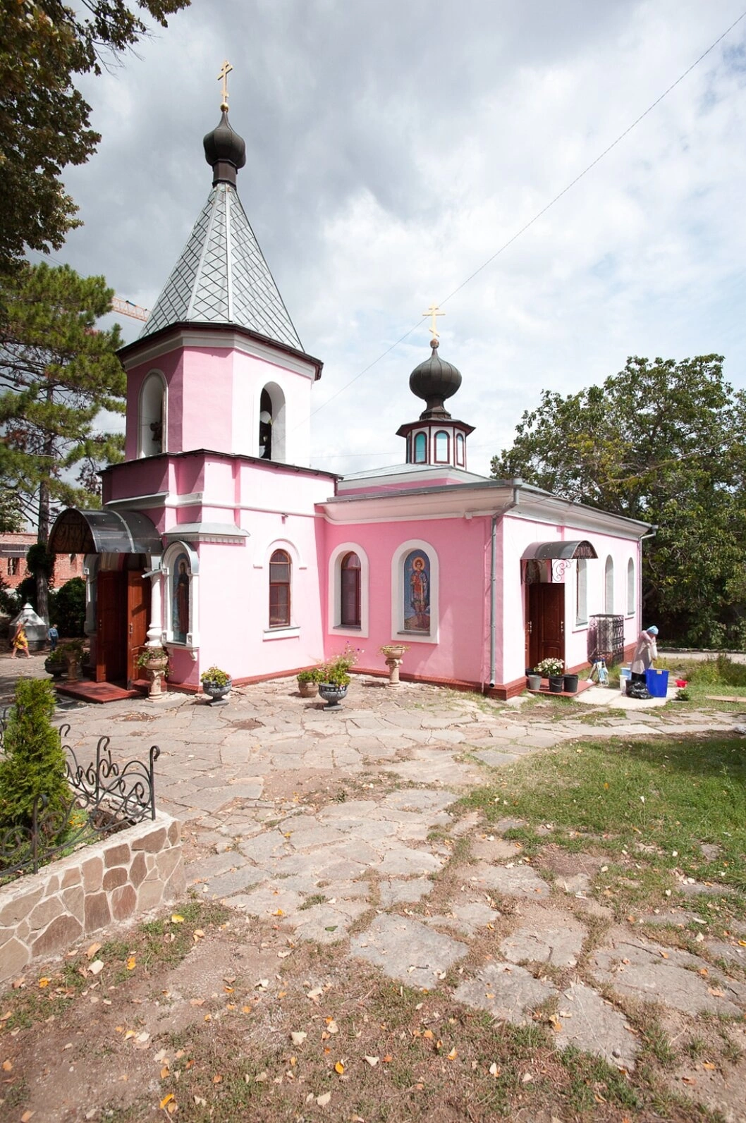 На представленной фотографии запечатлён один из храмов Свято-Троицкого Параскевиевского женского монастыря, расположенного в Крыму, в окрестностях села Тополёвка Белогорского района. Центральным объектом снимка является прекрасный розовый храм, увенчанный златоглавыми куполами с вознесёнными крестами, символом победы жизни над смертью. Рядом возвышается стройная колокольня, с которой разносится благовест, созывающий насельниц и паломников на молитву.