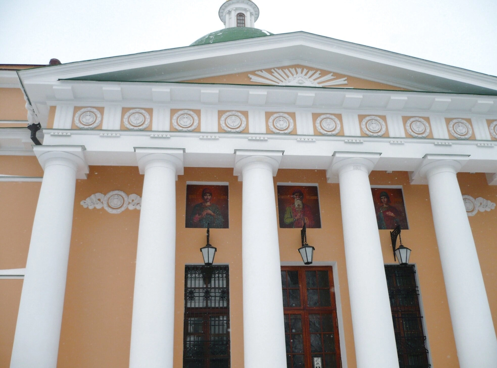 На представленной фотографии запечатлён величественный фасад Свято-Троицкого собора, являющегося смысловым и архитектурным центром Данилова ставропигиального мужского монастыря в Москве. Собор, освящённый во имя Живоначальной Троицы, был возведён в 1833–1838 годах по проекту известного московского архитектора Осипа Бове в стиле позднего классицизма.