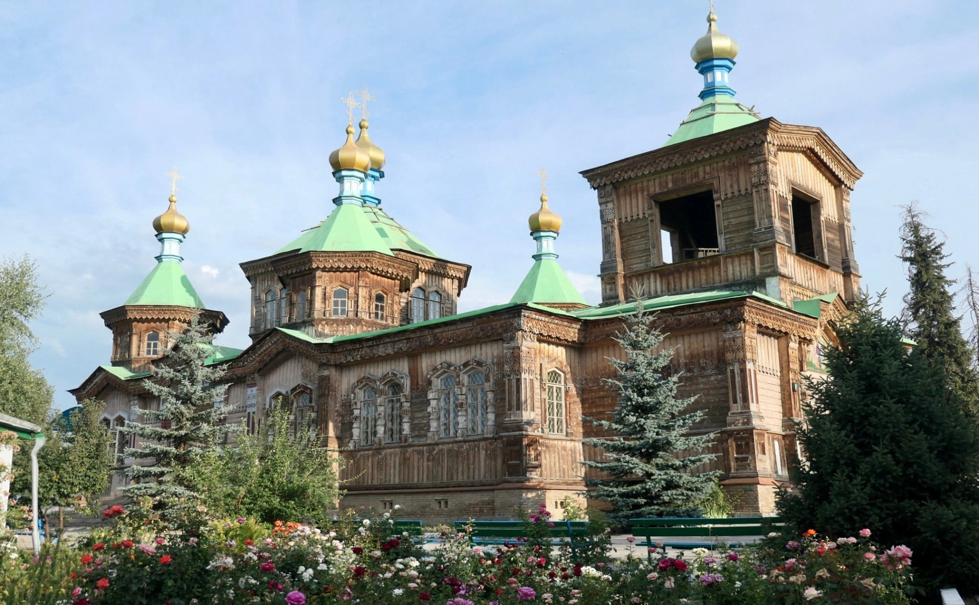 Собор был возведён в 1894–1895 годах по проекту архитекторов, вдохновлявшихся традициями древнерусской архитектуры. Уникальность храма заключается в том, что он целиком построен из тянь-шаньской ели без использования единого железного гвоздя, а соединения выполнены на деревянных шпонках. Пять златоглавых куполов, символизирующих Господа Иисуса Христа и четырёх евангелистов, гордо возносятся к небу, создавая неповторимый силуэт.