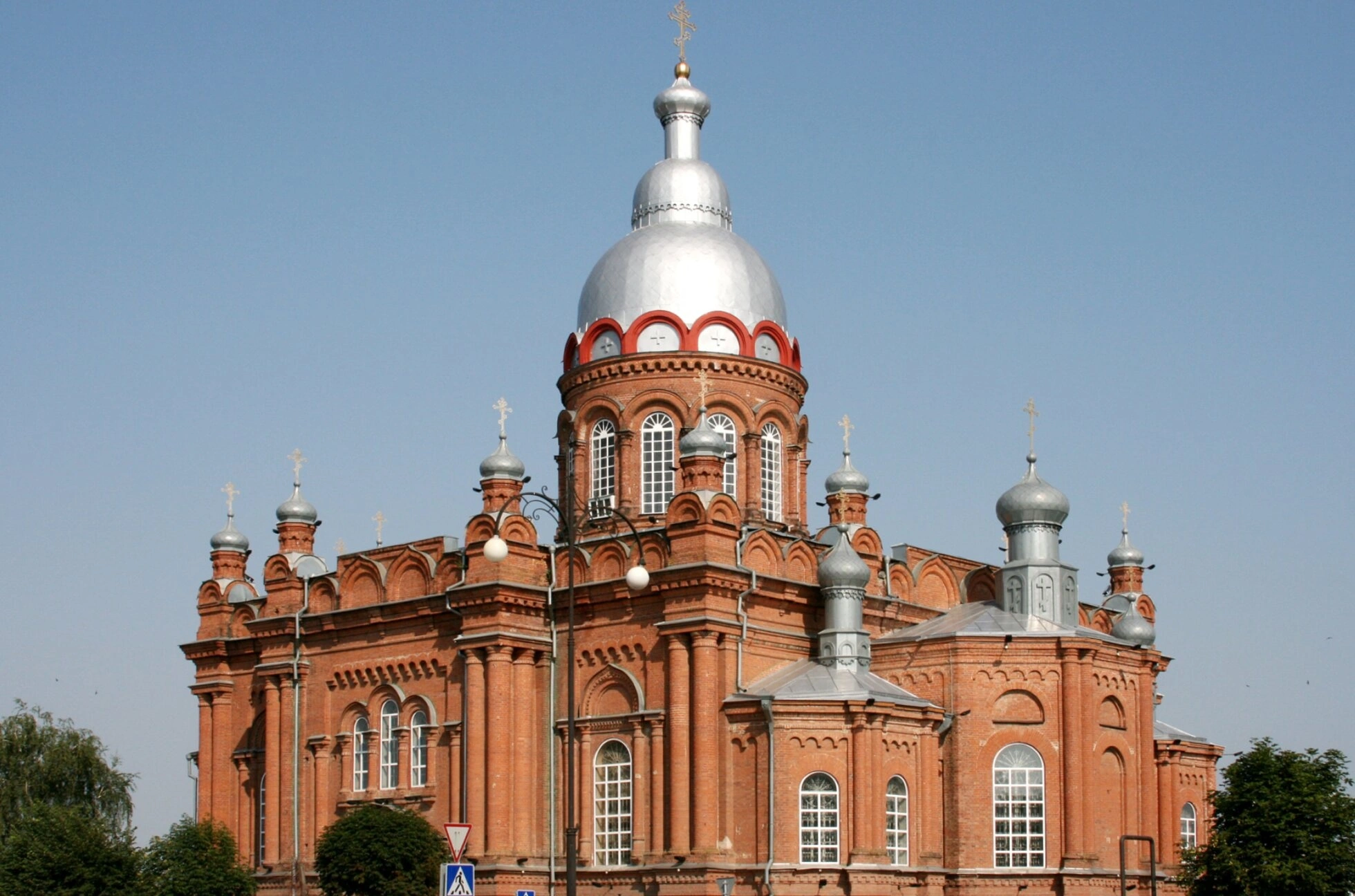 Храм венчает мощный световой барабан, увенчанный шлемовидным золочёным куполом, который символизирует Господа Иисуса Христа как главу Церкви. По углам основного объёма – четверика – расположены четыре декоративные главки, обозначающие четырёх евангелистов. Фасады собора богато украшены кирпичным узорочьем: аркатурные пояса, кокошники, ширинки и другие элементы, придающие сооружению неповторимый облик.