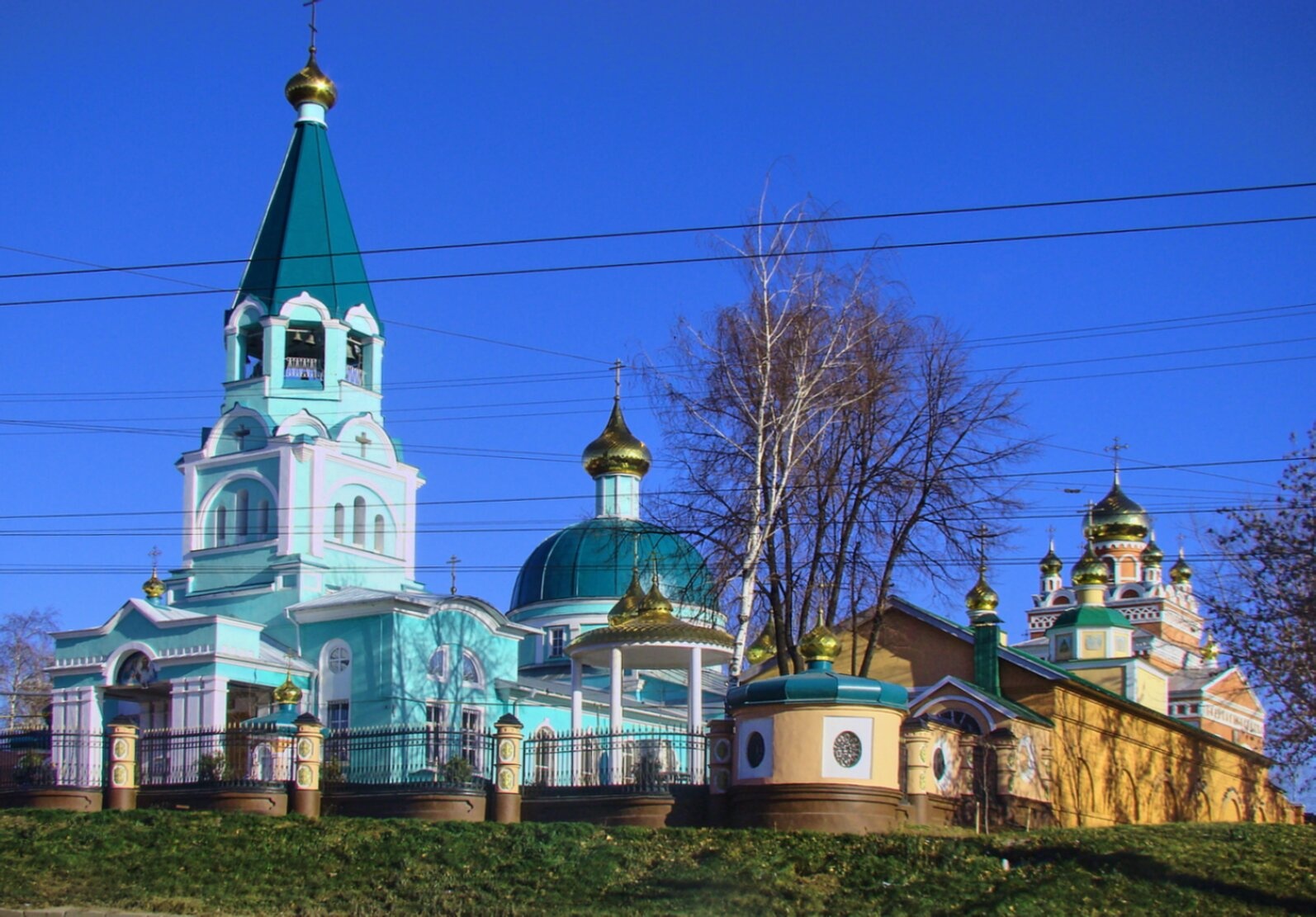 На представленной фотографии запечатлён величественный Свято-Троицкий собор, являющийся одной из главных православных святынь столицы Удмуртии — города Ижевска. Храм располагается в историческом центре города, на пересечении улиц Советской и Удмуртской, и его златоглавые купола, сияющие на солнце, создают неповторимый архитектурный облик этого места.