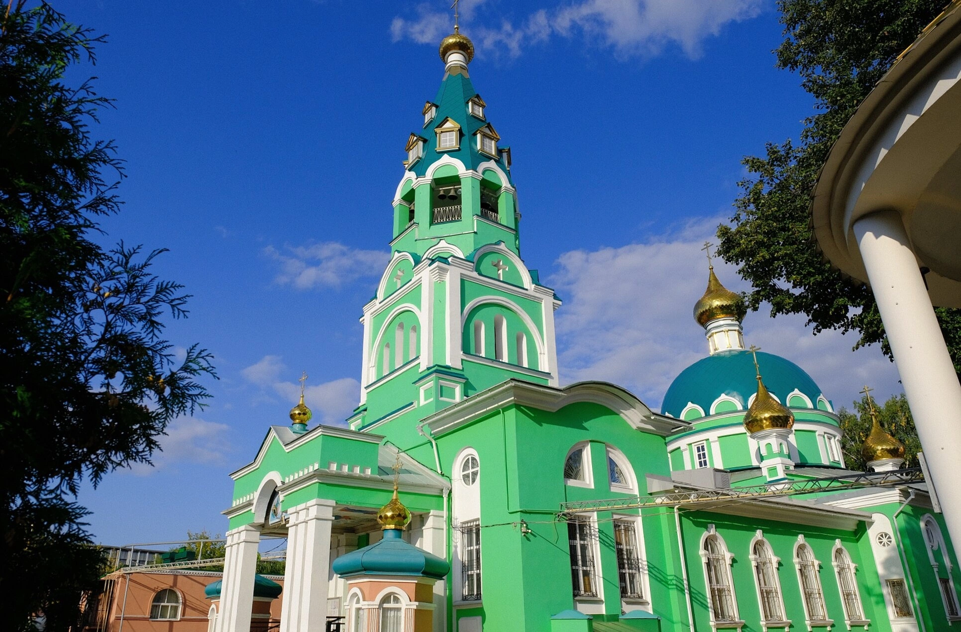 Архитектурный облик храма отличает гармоничное сочетание объемов и изящных пропорций. Здание окрашено в нежный светло-зеленый цвет с белоснежными декоративными элементами, что создает ощущение легкости и духовной чистоты. Высокая колокольня с золоченым куполом устремляется в небесную высь, символизируя молитвенное горение человеческой души к Богу.