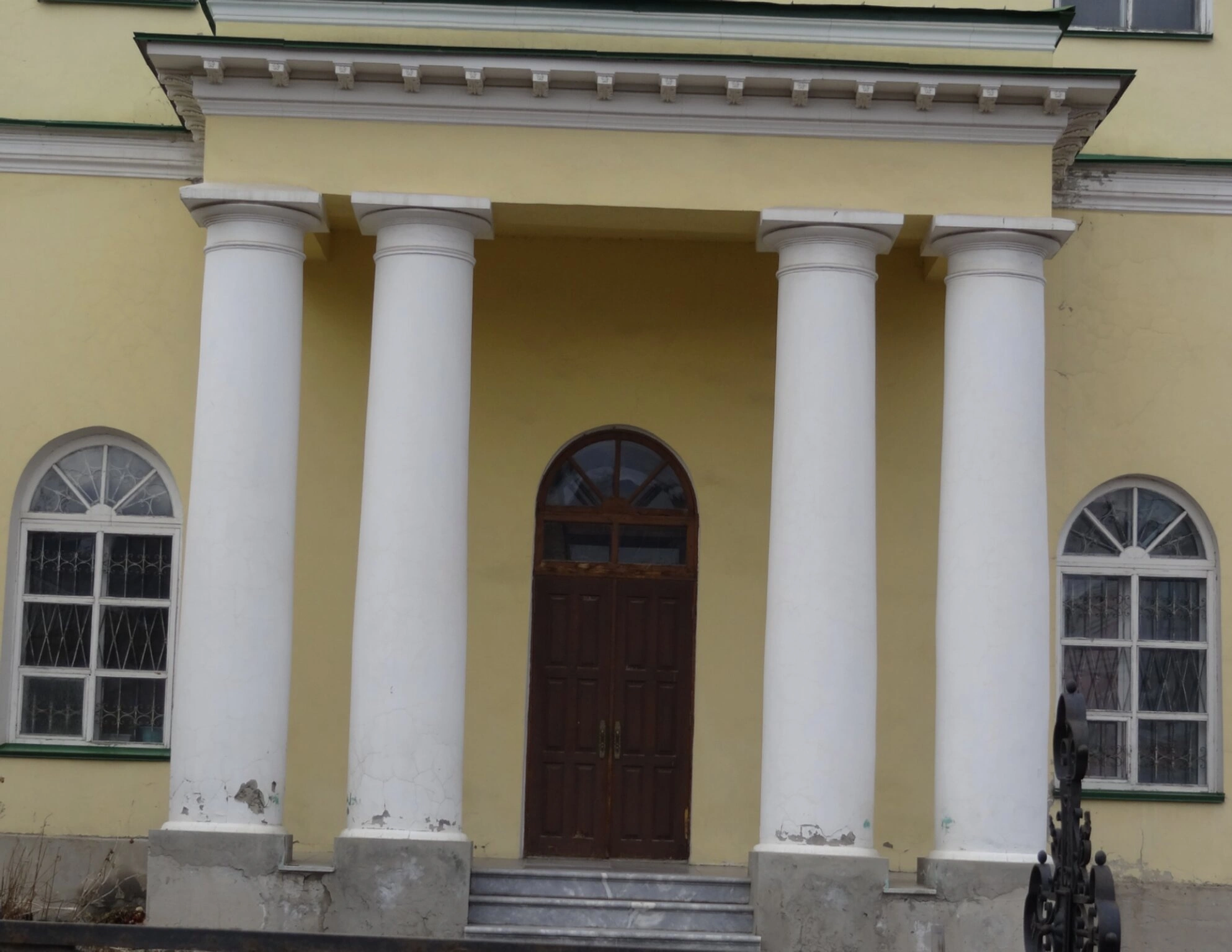 Фасад здания отличается гармоничным сочетанием желтых стен и серого каменного цоколя, что создает ощущение монументальности и духовной твердыни. Центральным архитектурным элементом композиции являются четыре белоснежные колонны, которые поддерживают фронтон и придают храму торжественный вид. Между колоннами расположены три арочных проема: два боковых оконных и центральный входной, ведущий в святая святых храма.