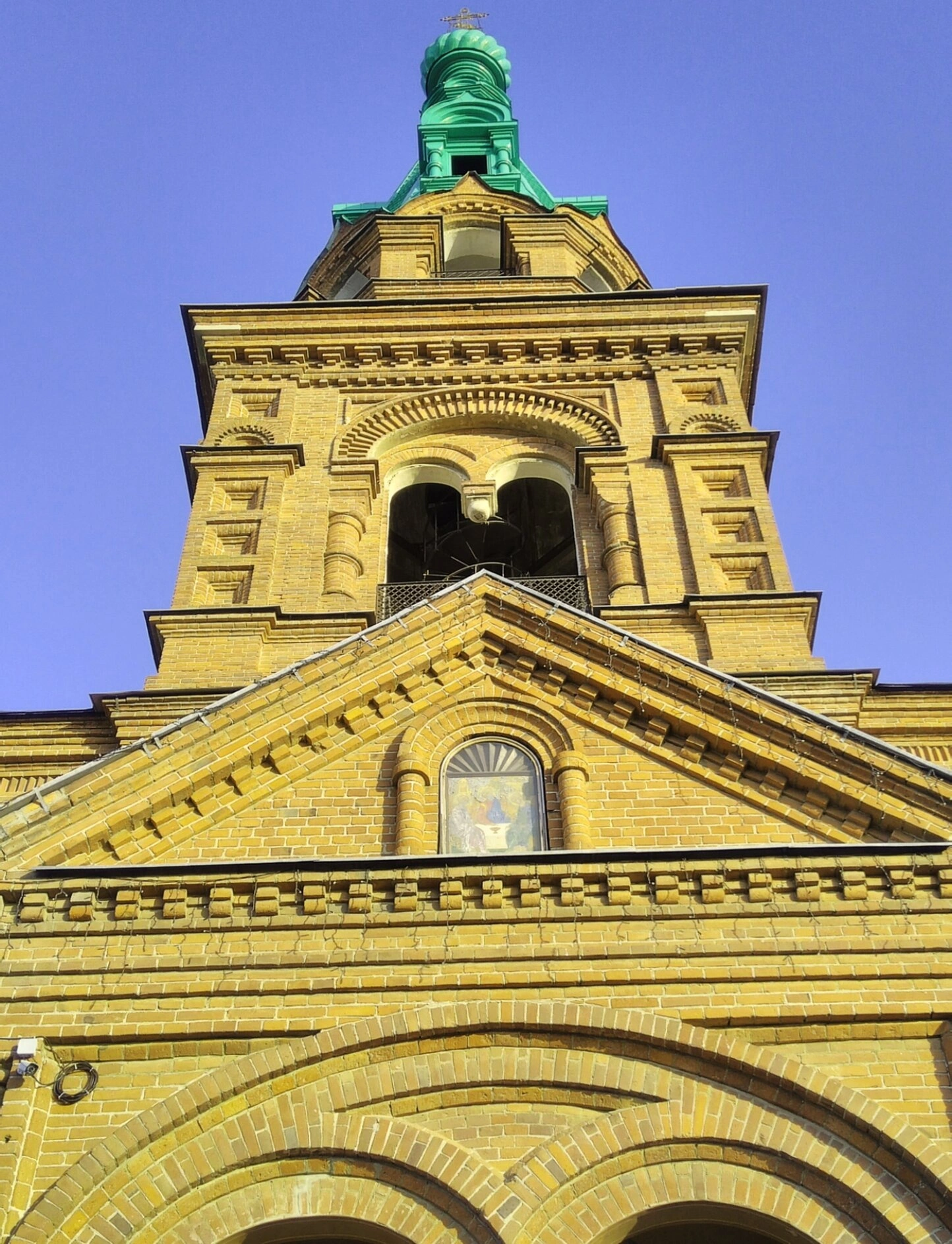 На фотографии хорошо просматривается крестово-купольная структура храма, увенчанного массивным центральным золочёным куполом, символизирующим Христа, и четырьмя меньшими главами. Фасад собора украшен килевидными закомарами, аркатурным поясом и узкими арочными окнами, что характерно для церковного зодчества конца XIX века. Отдельного внимания заслуживает высокая колокольня, составляющая единый ансамбль с основным зданием.