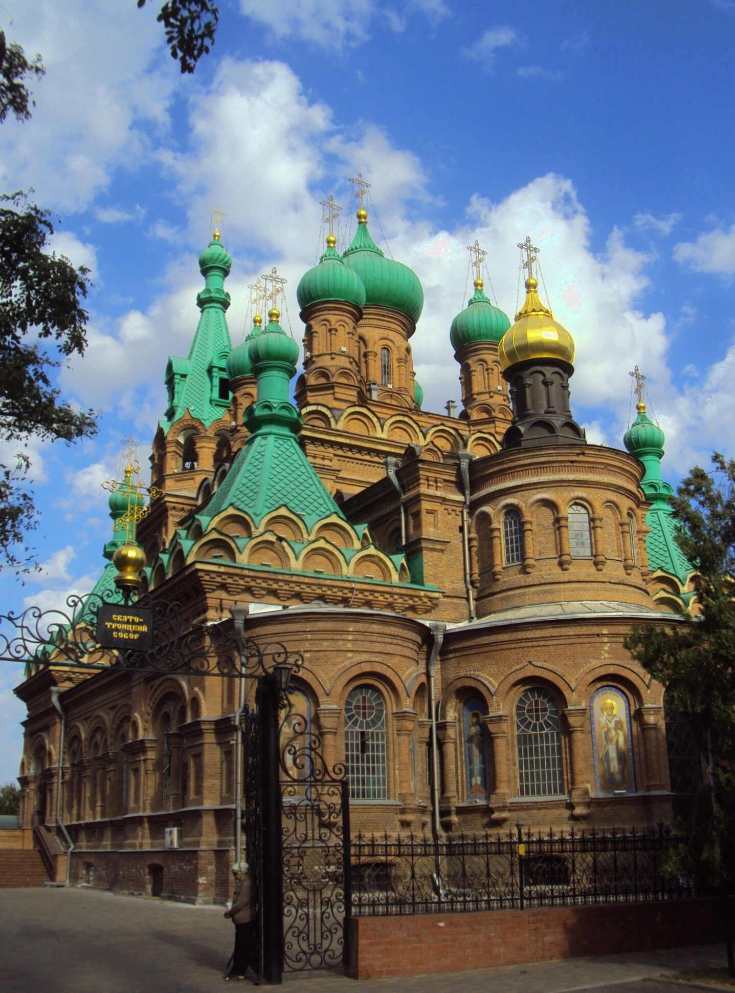 На фотографии запечатлён величественный Свято-Троицкий собор, являющийся одной из главных православных святынь города Краснодара. Монументальное кирпичное здание поражает своим масштабом и гармонией архитектурных форм, выполненных в традициях русского церковного зодчества.