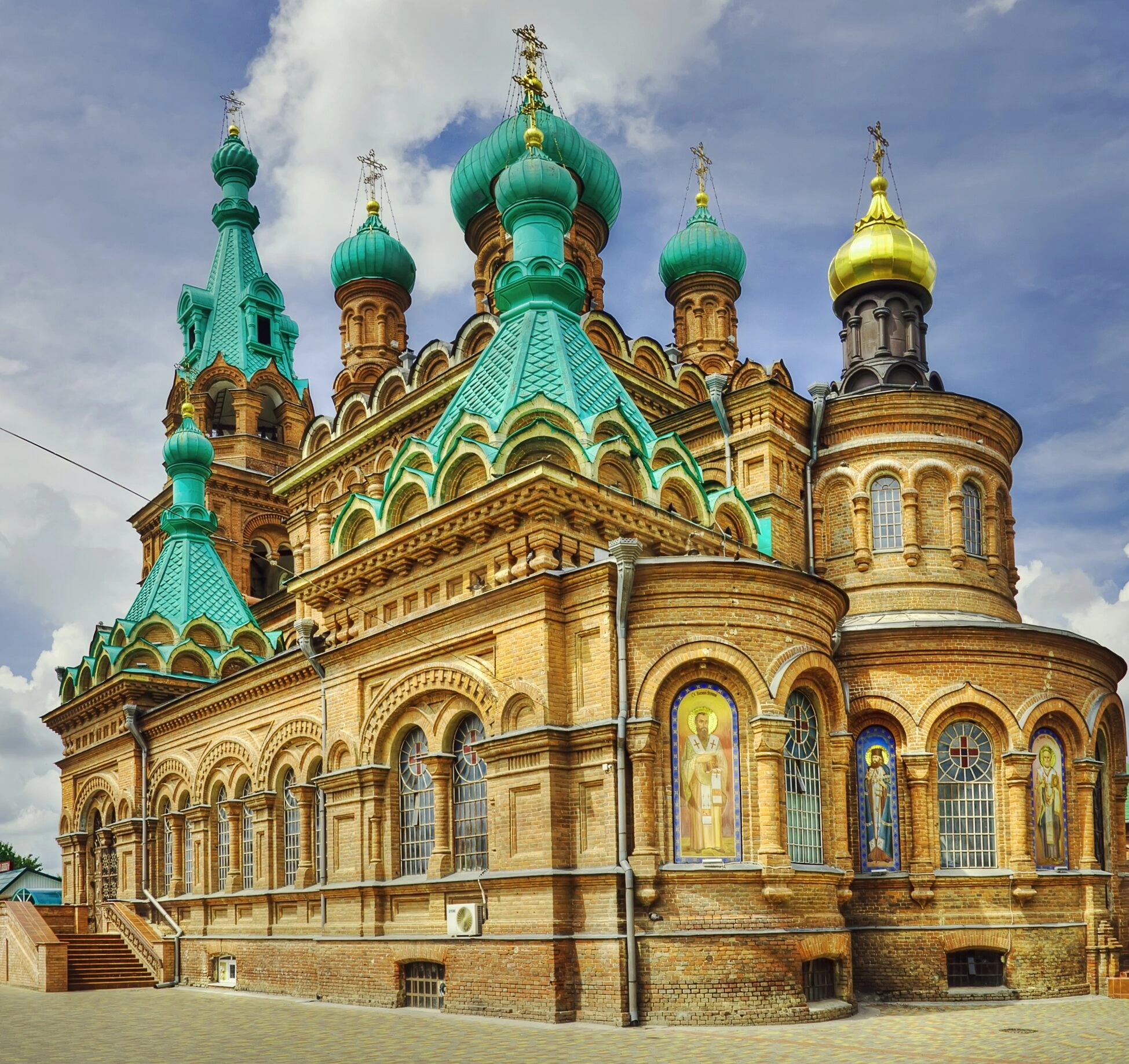 Фасад храма богато украшен декоративными элементами: арочными проёмами, килевидными кокошниками и изразцами. Над входами размещены мозаичные образы святых, встречающие молящихся перед входом в дом Божий. Высокая колокольня с золочёной главкой completes архитектурный ансамбль, придавая ему завершённость и гармонию.