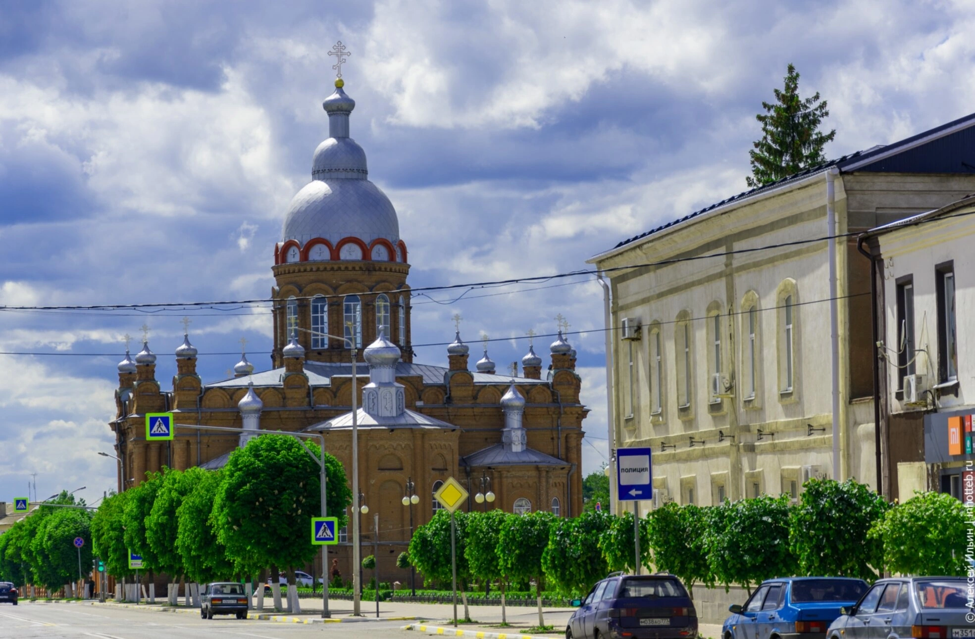 На представленной фотографии запечатлён Свято-Троицкий собор, расположенный в историческом центре города Обоянь Курской области. Этот величественный храм, возведённый в XIX столетии, является выдающимся памятником церковной архитектуры и духовным центром всего региона.