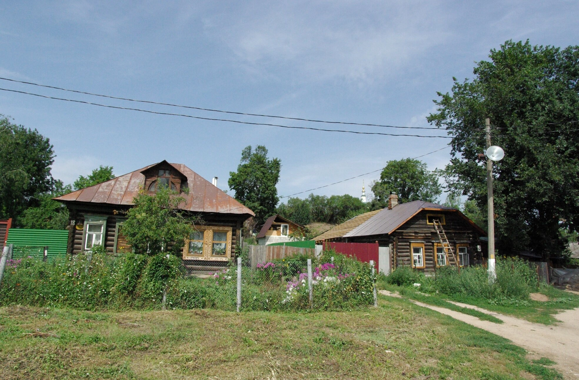 На переднем плане фотографии видны характерные элементы традиционного русского сельского пейзажа: деревянные дома с двускатными крышами, палисадники с цветами, огороженные скромными заборами. Грунтовая дорога, проходящая справа, ведёт к храму, что символически отражает путь верующих к святыне.