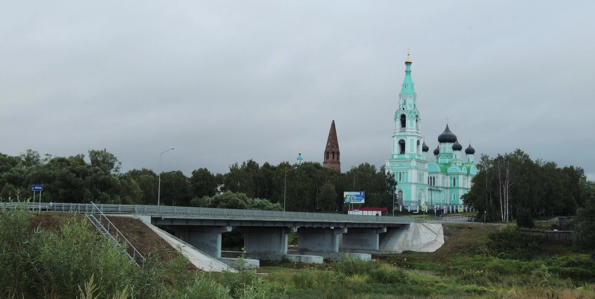 На представленной фотографии запечатлён величественный вид на Свято-Троицкий собор в городе Яранске, открывающийся с противоположного берега реки Ярань. На переднем плане изображён мост через тихую речную гладь, ведущий к святым вратам храма. Этот мост символически соединяет мирскую суету с духовным пристанищем.