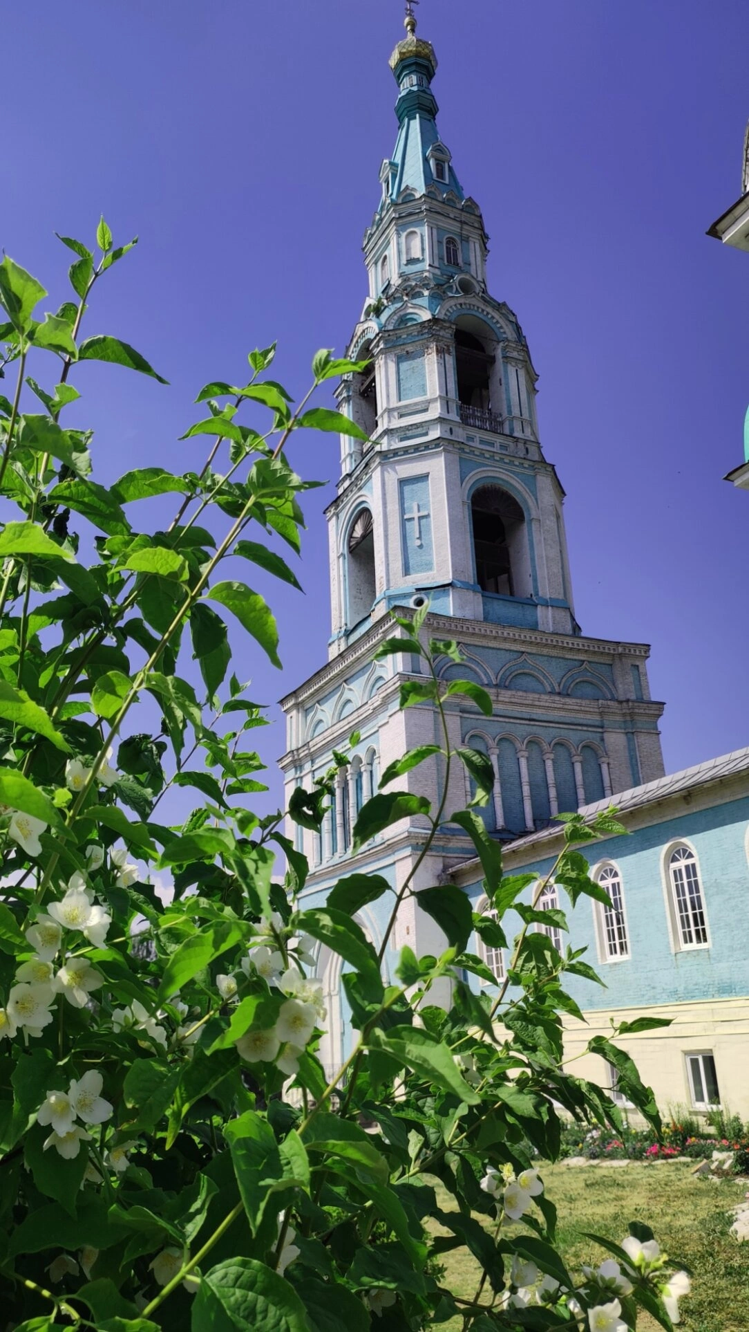 На представленной фотографии запечатлена колокольня и часть северного фасада Свято-Троицкого собора, являющегося архитектурной доминантой и одной из главных православных святынь города Яранска Кировской области. Снимок сделан в тёплое время года, о чём свидетельствуют lushные цветущие кусты с белоснежными цветами на переднем плане, которые живописно обрамляют монументальное церковное здание.