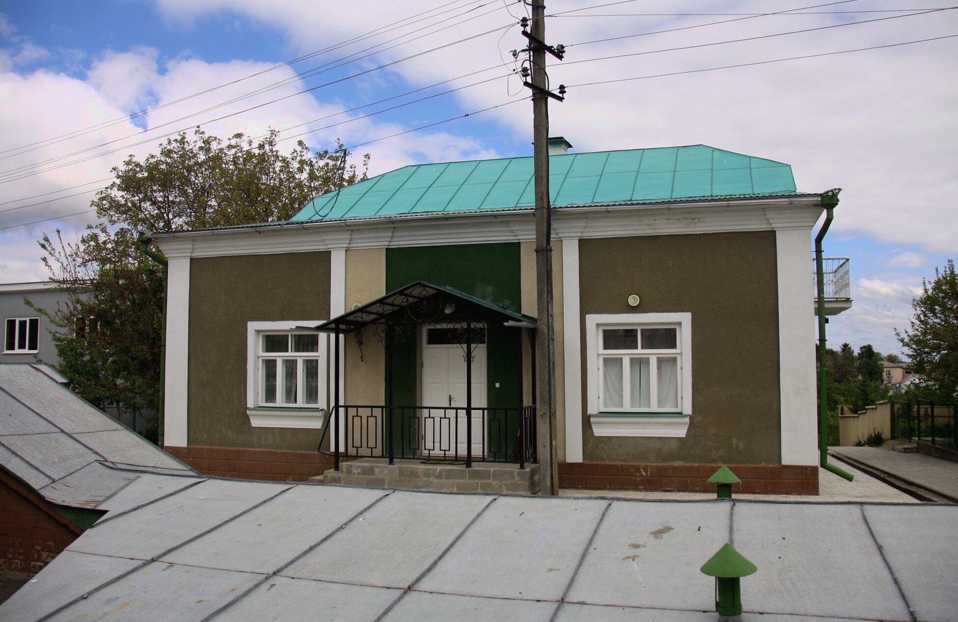 На представленной фотографии запечатлён архитектурный элемент Свято-Троицкого ставропигиального женского монастыря, расположенного в городе Корец Ровенской области. Изображённое одноэтажное здание, окрашенное в благостные бежевые и зелёные тона с белыми декоративными элементами, является частью святой обители. Двускатная кровля и скромный балкон с перилами и защитным навесом перед входом свидетельствуют о традиционном подходе к монастырскому зодчеству.