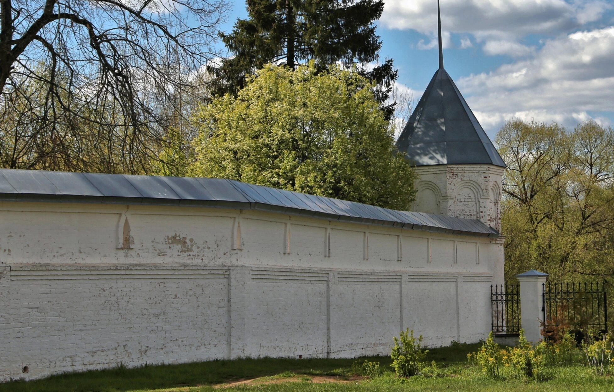На представленной фотографии запечатлён фрагмент архитектурного ансамбля Свято-Троицкого Стефано-Махрищского мужского монастыря, одной из древних православных обителей Подмосковья. На переднем плане изображён участок белокаменной монастырской ограды с мощными стенами и серой кровлей, выполнявшей в прошлом не только символическую, но и оборонительную функцию. За стеной величественно возвышается северо-восточная башня монастырского каре, увенчанная остроконечным шатром со скромной главкой, что является характерным элементом русской церковной архитектуры XVII-XVIII веков.