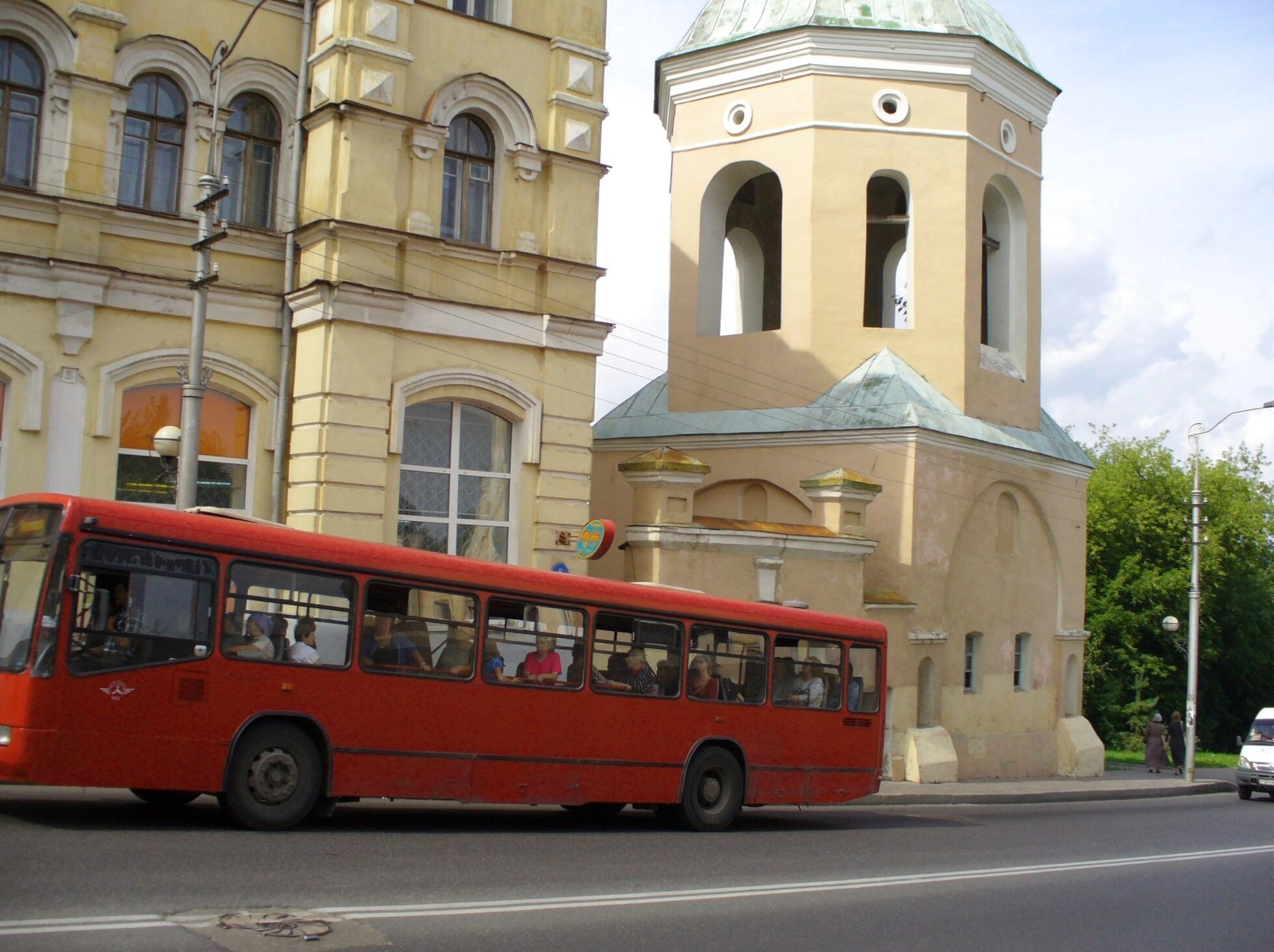 Справа от дороги виднеются зелёные кроны деревьев, добавляющие пейзажу свежести и природной гармонии. На заднем плане, у обочины, можно заметить фигуры людей, что придаёт снимку особый дух оживлённости и повседневности. Присутствие пассажиров в автобусе и пешеходов на улице напоминает о том, что монастырь является не только памятником истории, но и действующей обителью, живущей своей духовной жизнью в сердце большого города.