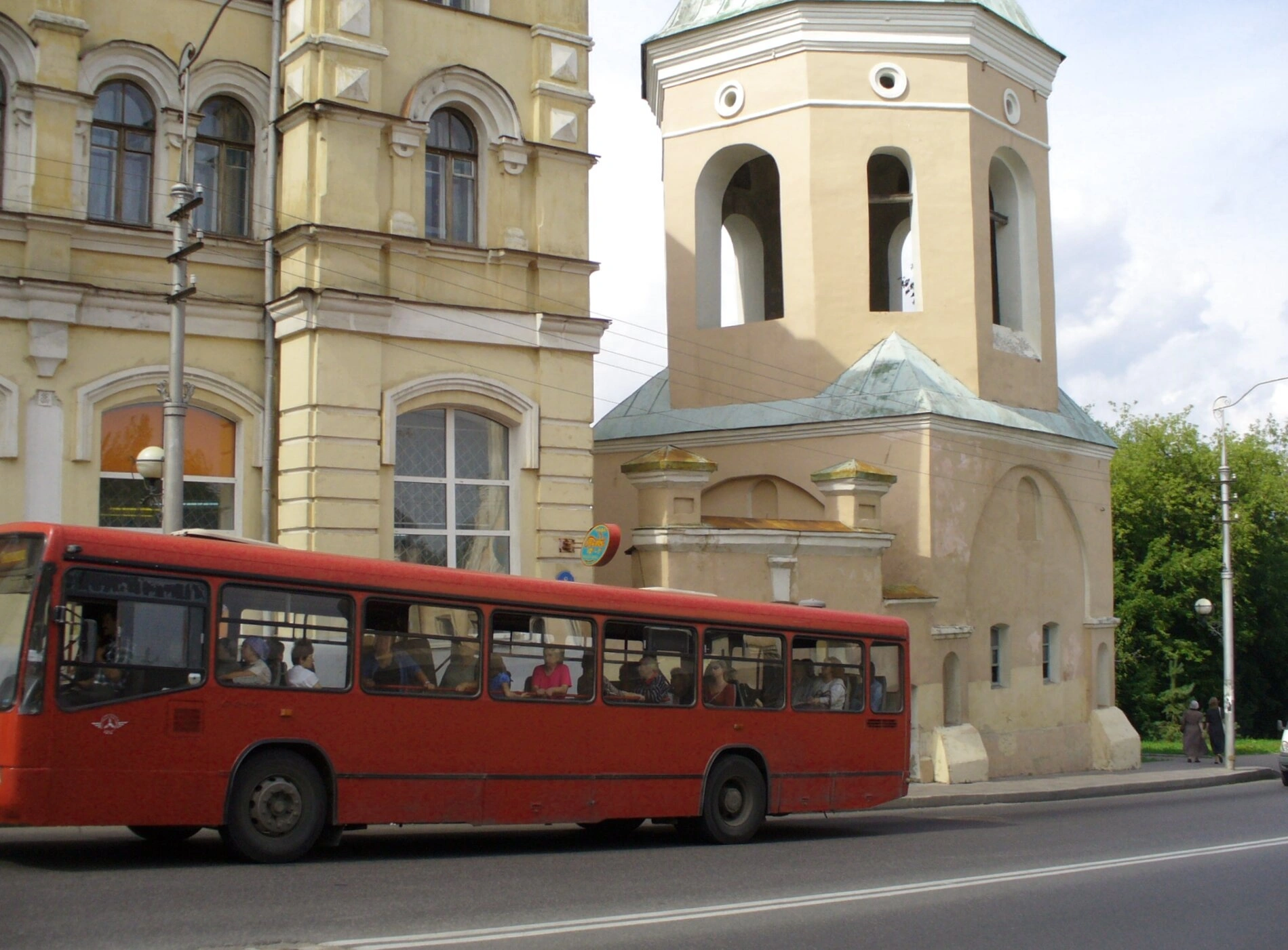 На представленной фотографии запечатлён вид на один из старейших православных монастырей Смоленска — Свято-Троицкий женский монастырь. На переднем плане, символично отражая связь духовной обители и современной городской жизни, движется красный автобус. Главным объектом съёмки является величественный архитектурный ансамбль монастыря, расположенный справа.