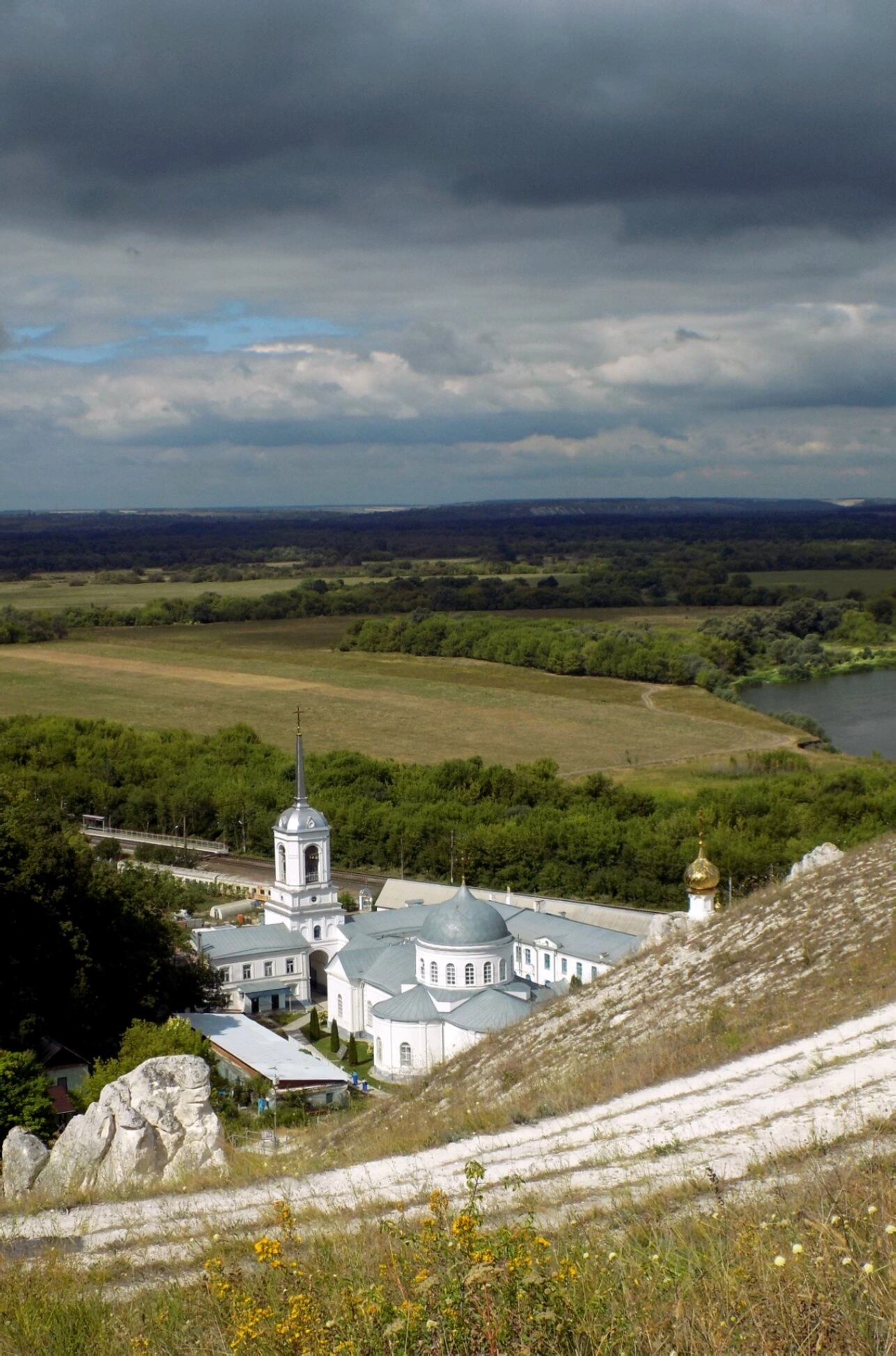 Уникальность монастыря заключается в его пещерных сооружениях, высеченных в толще меловой горы. На фотографии можно видеть наземные храмы и постройки монастыря, гармонично вписанные в природный ландшафт. Архитектурный ансамбль, формировавшийся на протяжении нескольких веков, представляет величественное зрелище духовной твердыни, возвышающейся над донскими просторами.