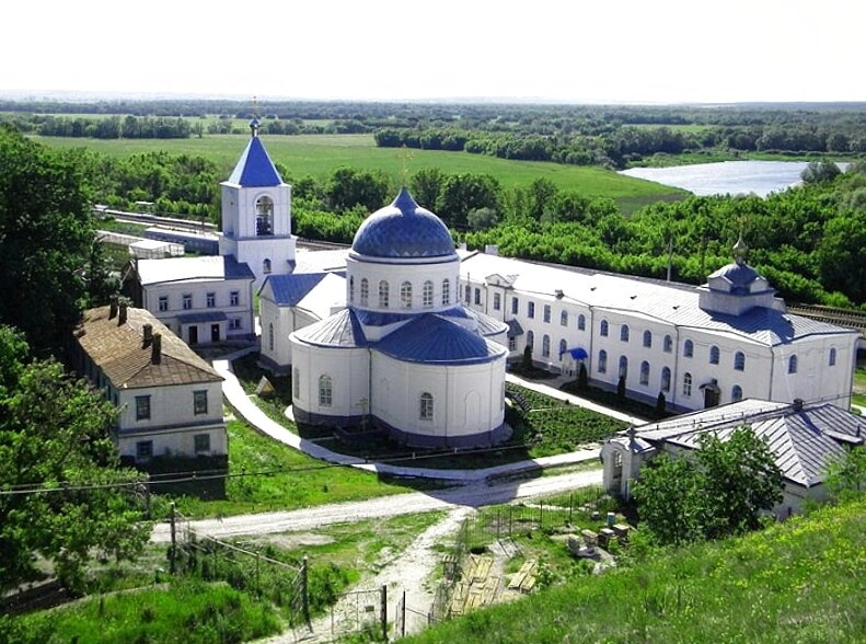 Обитель окружена холмистой местностью, покрытой пышными лиственными лесами, что создаёт ощущение уединённости и покоя, столь необходимых для иноческой жизни. На заднем плане открываются виды на бескрайние поля и гладь реки, подчёркивая неразрывную связь творения рук человеческих с Божьим миром. Исторически монастырь основан иноками-подвижниками, пришедшими сюда, по преданию, из Сицилии в XVII веке, искавшими уединения для молитвенных подвигов в меловых пещерах, которые и поныне являются одной из главных святынь обители.