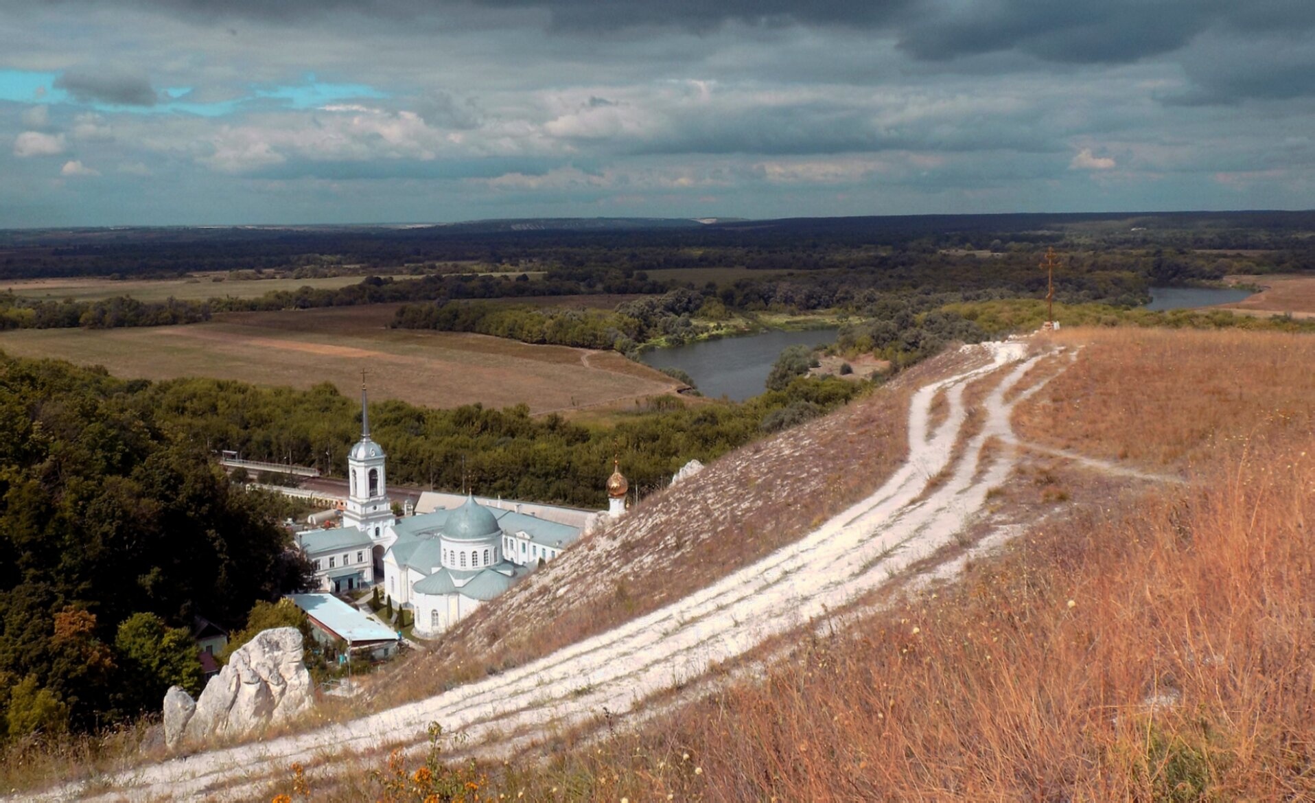На представленной фотографии запечатлён величественный ансамбль Свято-Успенского Дивногорского мужского монастыря, расположенного в живописной местности Воронежской области. Монастырь, основанный в середине XVII века, является одной из наиболее почитаемых православных обителей Центральной России. Архитектурный комплекс гармонично вписан в уникальный природный ландшафт с меловыми образованиями-дивами, которые и дали название всей местности - Дивногорье.