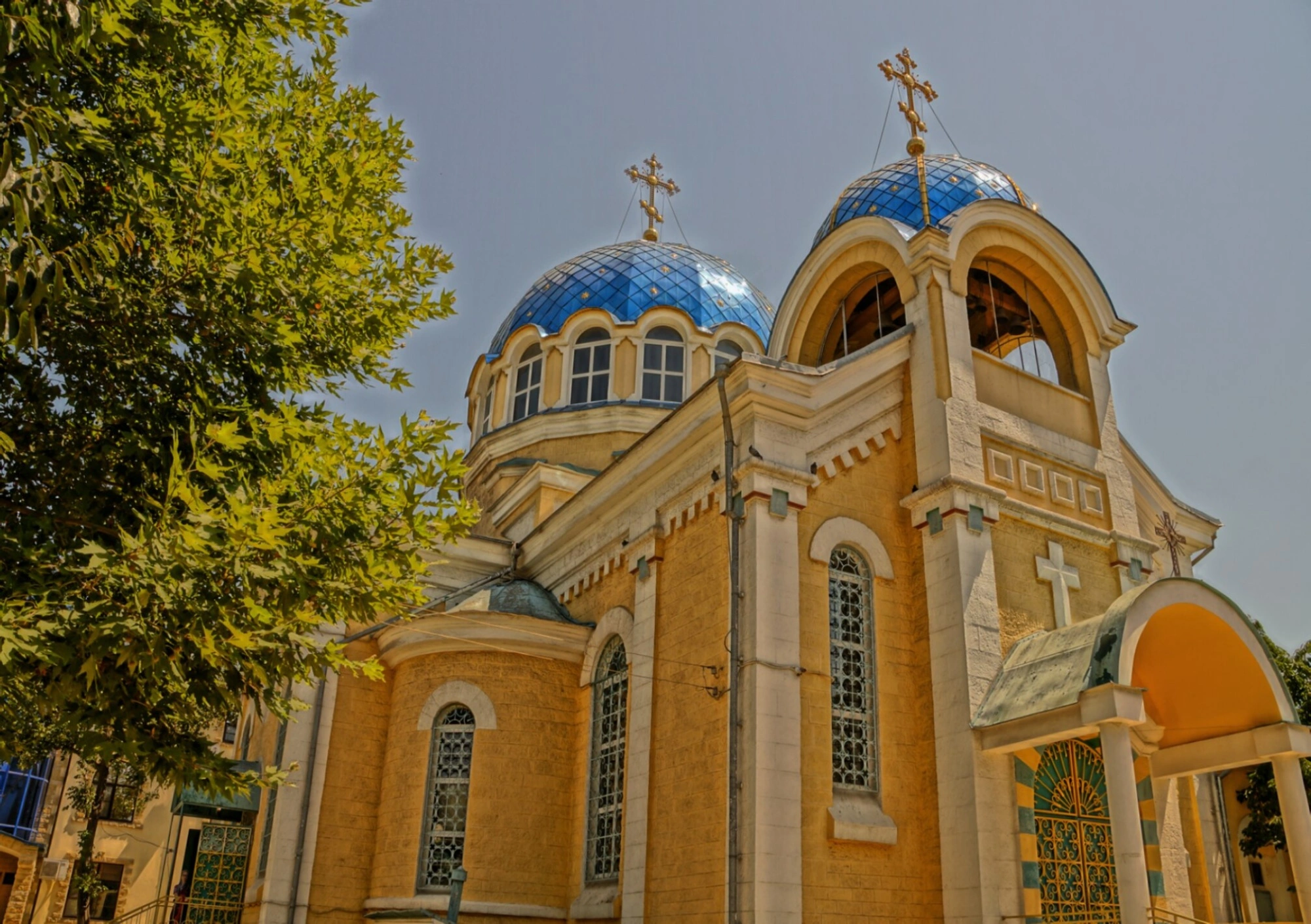 На фотографии запечатлён величественный Свято-Успенский кафедральный собор, являющийся главным православным храмом Махачкалы и всей Дагестанской митрополии. Собор освящён в честь Успения Пресвятой Богородицы — одного из двенадцати великих церковных праздников.