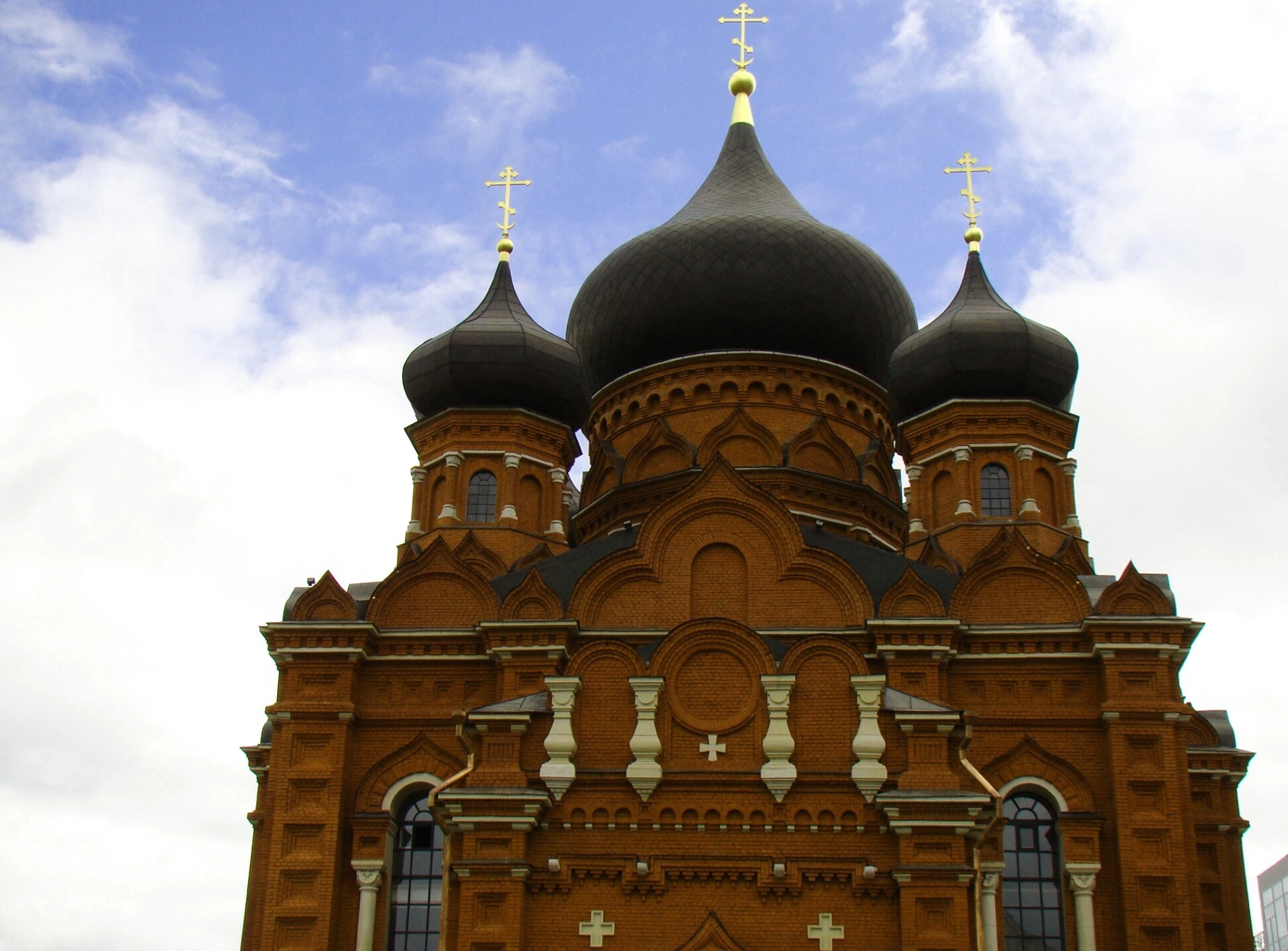На представленной фотографии запечатлён величественный Свято-Успенский кафедральный собор, являющийся архитектурной доминантой и главной православной святыней города Тулы. Снимок позволяет в деталях рассмотреть монументальное здание храма, возведённое из тёмно-красного кирпича в русско-византийском стиле, который был особенно популярен в церковном зодчестве во второй половине XIX века.