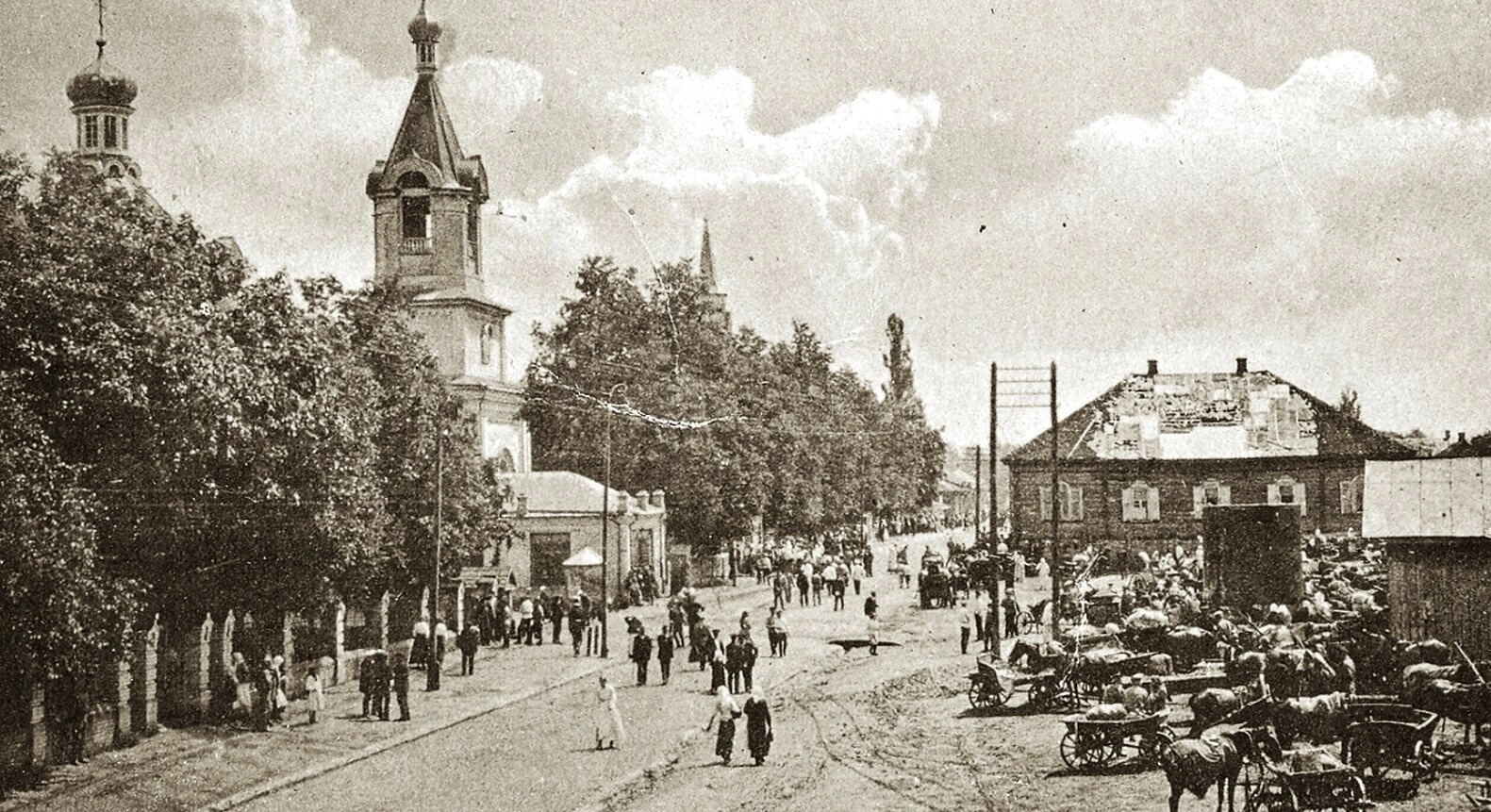 Всю сцену обрамляют высокие раскидистые деревья с густой листвой, создающие тень и уют вдоль улицы. Эта историческая фотография является бесценным свидетельством, позволяющим современному поколению верующих и горожан увидеть подлинный облик утраченной святыни и ощутить атмосферу жизни предков более чем столетней давности.