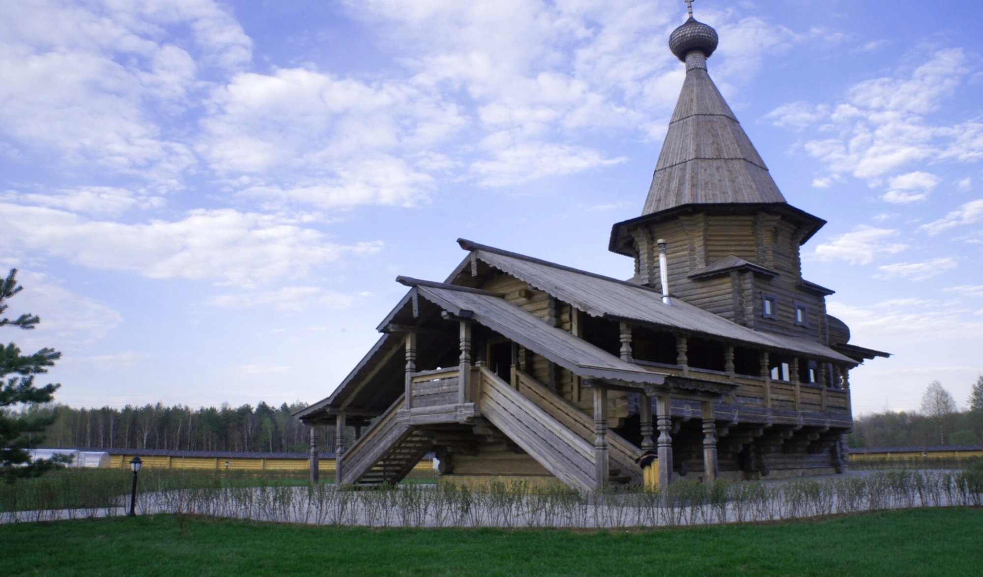На фотографии запечатлён Свято-Владимирский мужской монастырь, возведённый у самого истока великой русской реки Днепр в урочище Рождество Сычёвского района Смоленской области. Центральным объектом снимка является деревянный храм во имя святого равноапостольного князя Владимира, созданный в традициях древнерусского зодчества. Стройный шатёр с главкой-луковкой, увенчанной православным крестом, устремляется в небо, символизируя молитвенное горение человеческой души.