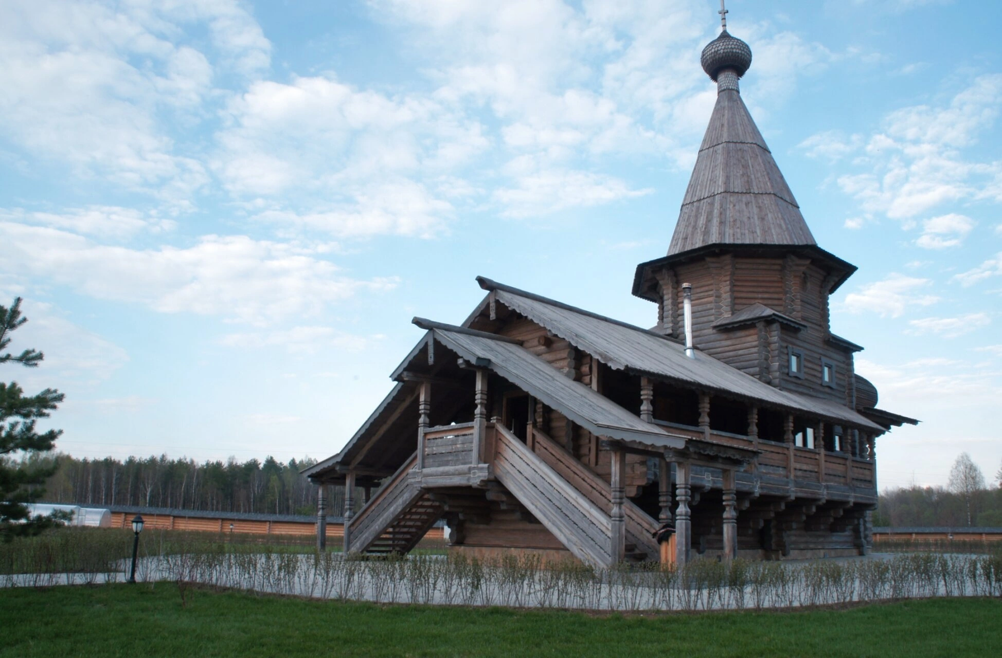 Монастырь был основан в честь святого равноапостольного князя Владимира, крестителя Руси, что символично связывает его с истоком одной из главных водных артерий страны, берущей своё начало из чистого родника в этом заповедном уголке. На снимке видна деревянная церковь, являющаяся сердцем обители. Её стройный силуэт, увенчанный главкой с крестом, гармонично вписывается в окружающий природный ландшафт, создавая образ единения молитвенного подвига и творения Божия.