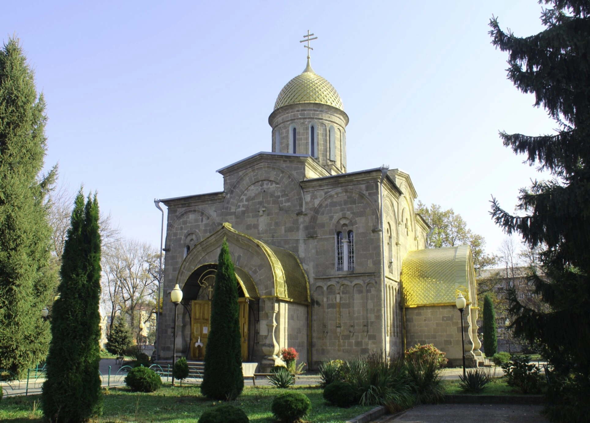 На представленной фотографии запечатлён величественный Свято-Вознесенский кафедральный собор, находящийся в городе Алагире Республики Северная Осетия-Алания. Этот православный храм является одним из духовных центров региона и выдающимся памятником русской церковной архитектуры XIX столетия.