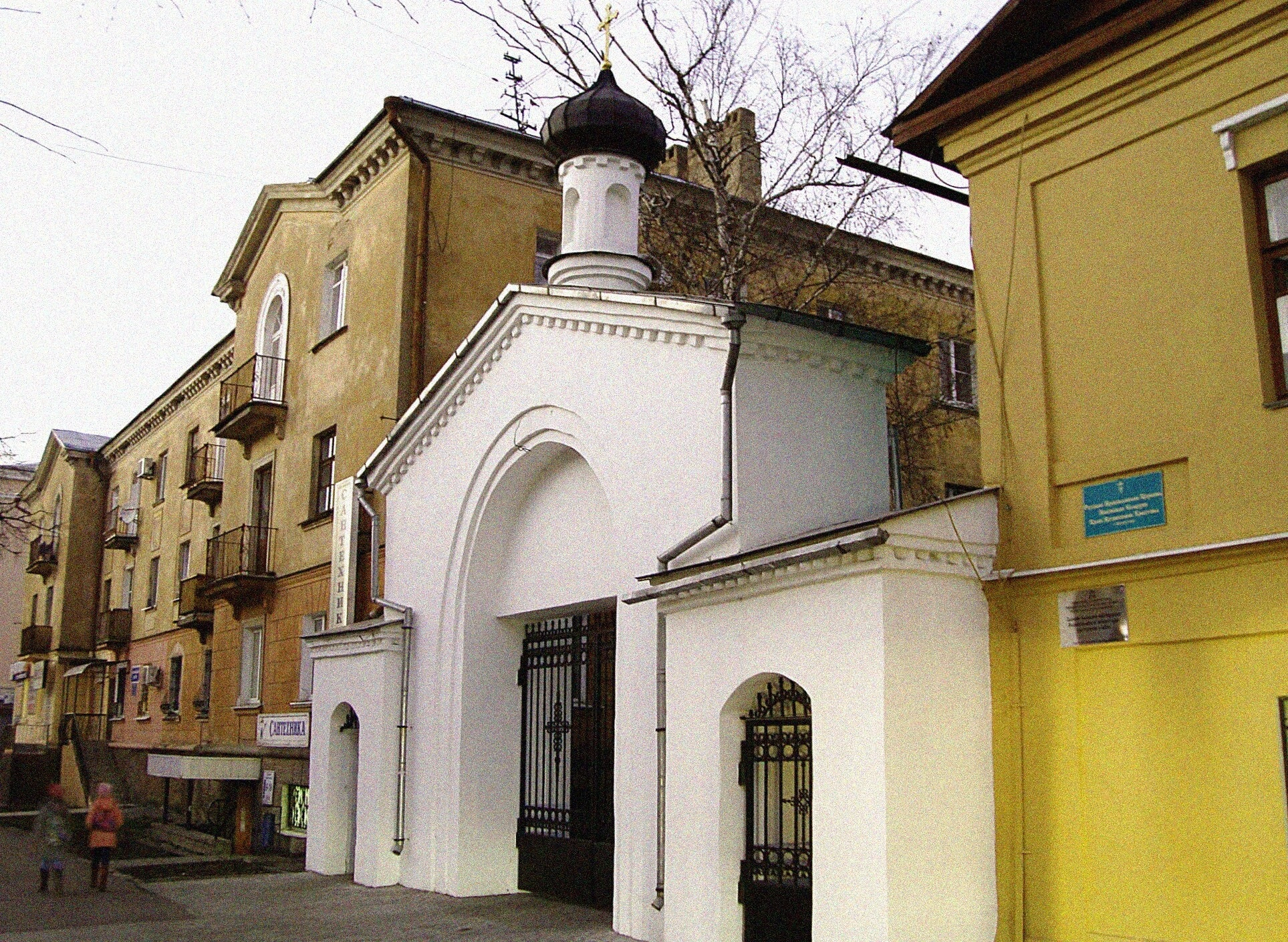 На фотографии запечатлены Святые врата с надвратной колокольней Свято-Вознесенского кафедрального собора, являющегося главным православным храмом города Великие Луки. Этот величественный собор, освящённый в честь Вознесения Господня, был возведён в 1752 году на месте древнего храма и служит ярким образцом русского церковного зодчества.
