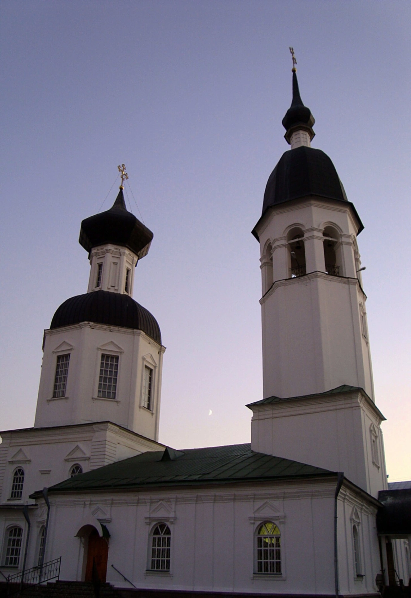 Белоснежные стены собора, символизирующие чистоту и святость, устремляются ввысь, гармонично сочетаясь с тёмными, почти чёрными куполами, увенчанными златоглавыми православными крестами, сияющими даже в слабом свете. Высокая многоярусная колокольня с остроконечным шпилем доминирует в архитектурной композиции, свидетельствуя о торжестве православной веры. Центральный купол, традиционный для русского храмового зодчества, олицетворяет Господа Иисуса Христа.