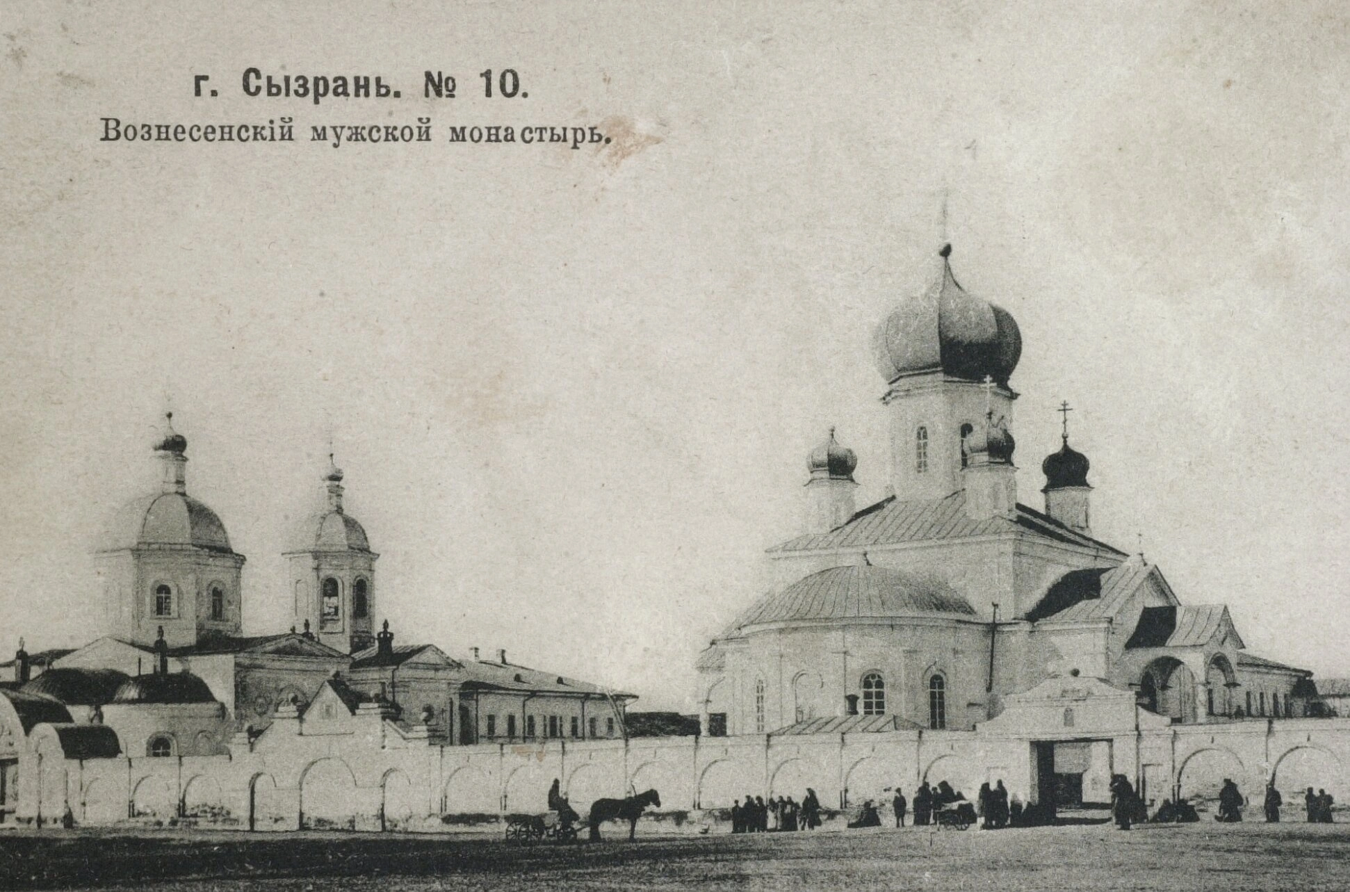 На представленной фотографии запечатлён Свято-Вознесенский мужской монастырь в городе Сызрани — одна из значимых православных обителей Самарской земли. Снимок передаёт архитектурный облик монастырского комплекса, сохранившего дух исторического прошлого. На переднем плане видны массивные монастырские ворота и ограда, за которыми возвышаются купола храмов. Примечательны фигуры людей и конная повозка у входа, что позволяет отнести снимок к концу XIX — началу XX века.