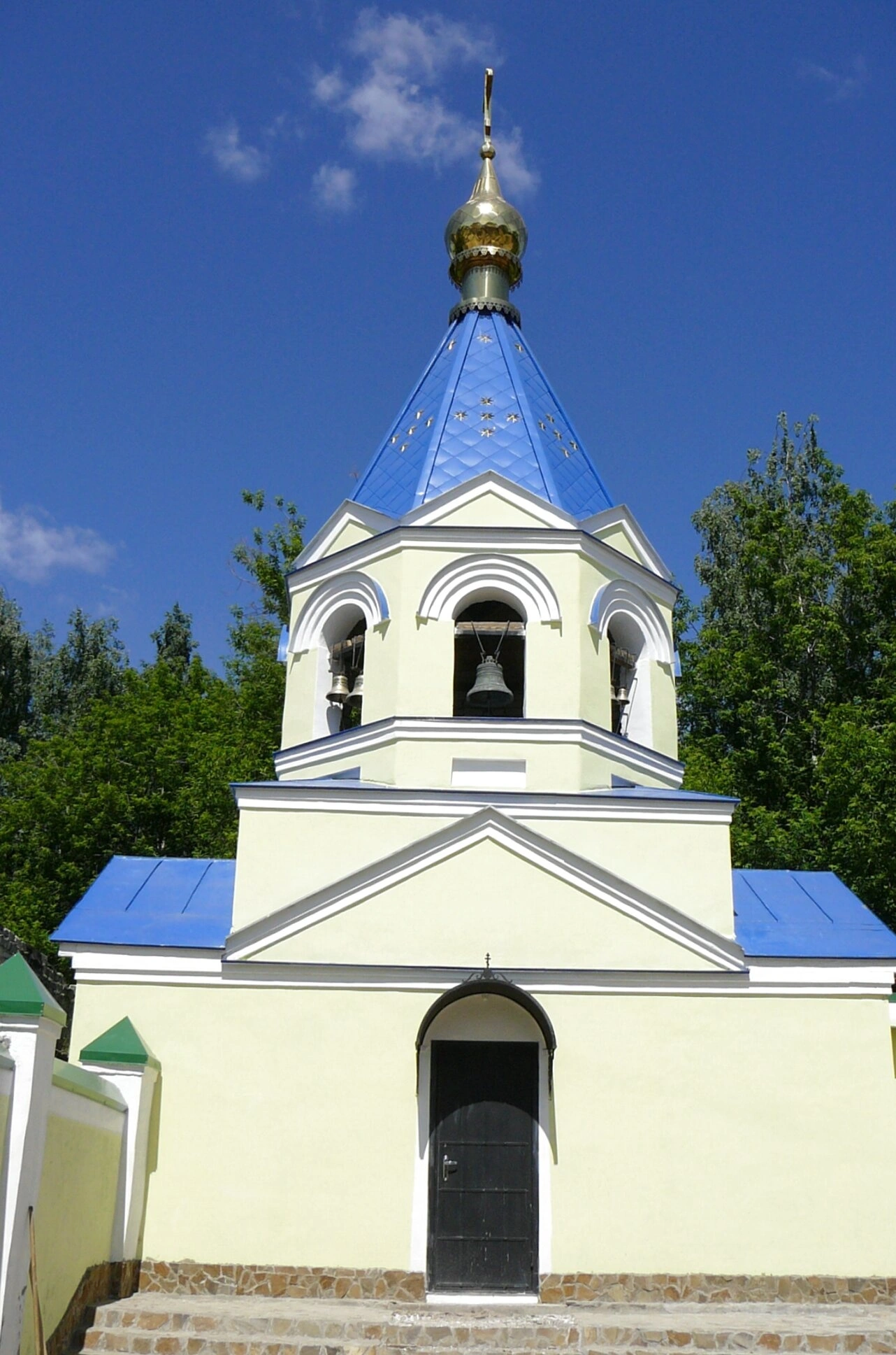 Главный фасад храма, окрашенный в тёплые светло-желтые тона, символизирует духовную радость и благодать. Над ним возносится синий купол, увенчанный златым крестом, что олицетворяет небесную чистоту и славу Господню. Рядом высится стройная колокольня, зовущая верующих на молитву своим благозвучным благовестом.