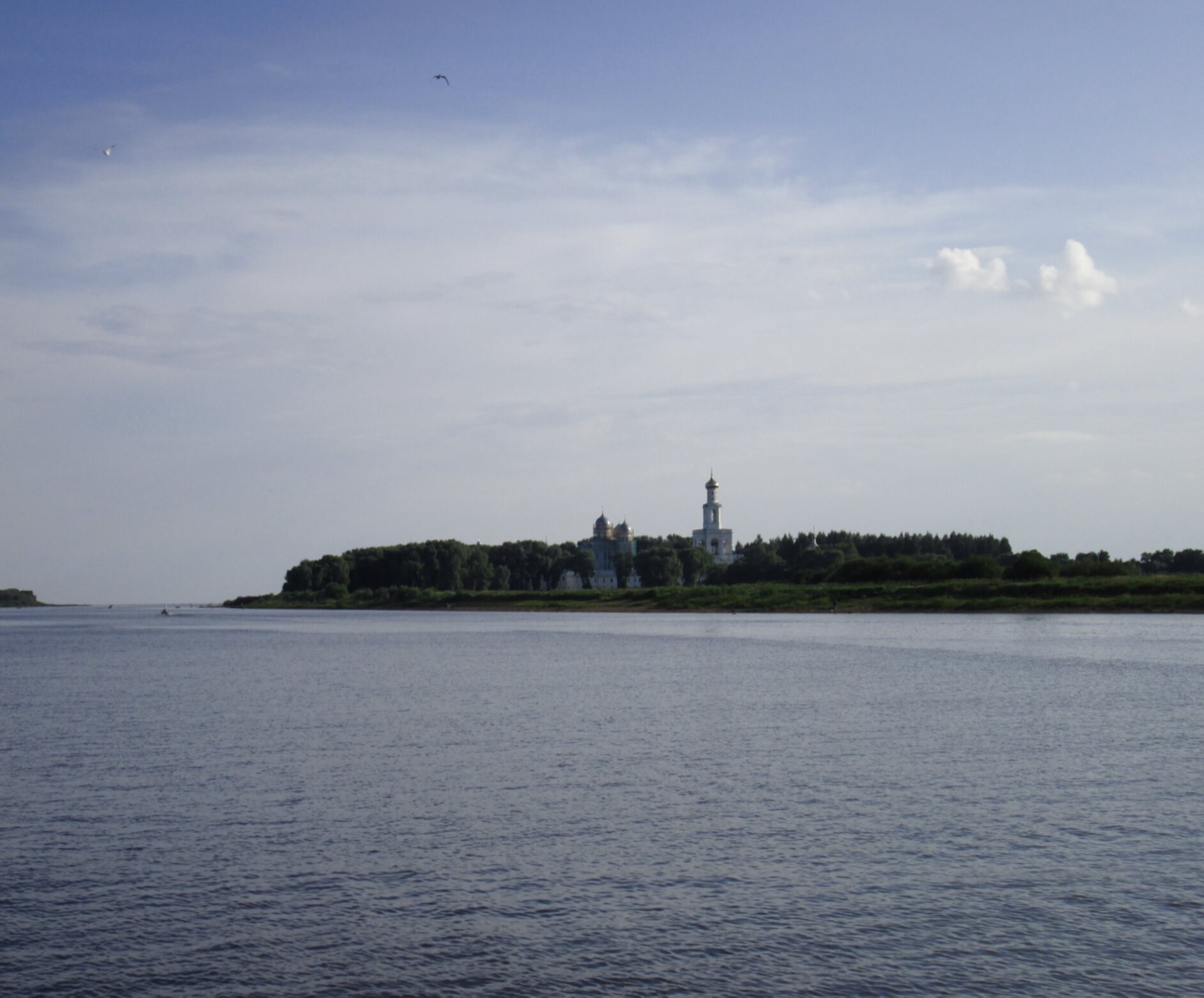 На переднем плане открывается широкая водная гладь реки Волхов, несущей свои спокойные воды к озеру Ильмень. Вдали, на возвышенном берегу, возлегает монастырская обитель, окружённая зеленью деревьев. Среди крон ясно выделяются золотые купола храмов и стройная колокольня, устремлённая в небеса.