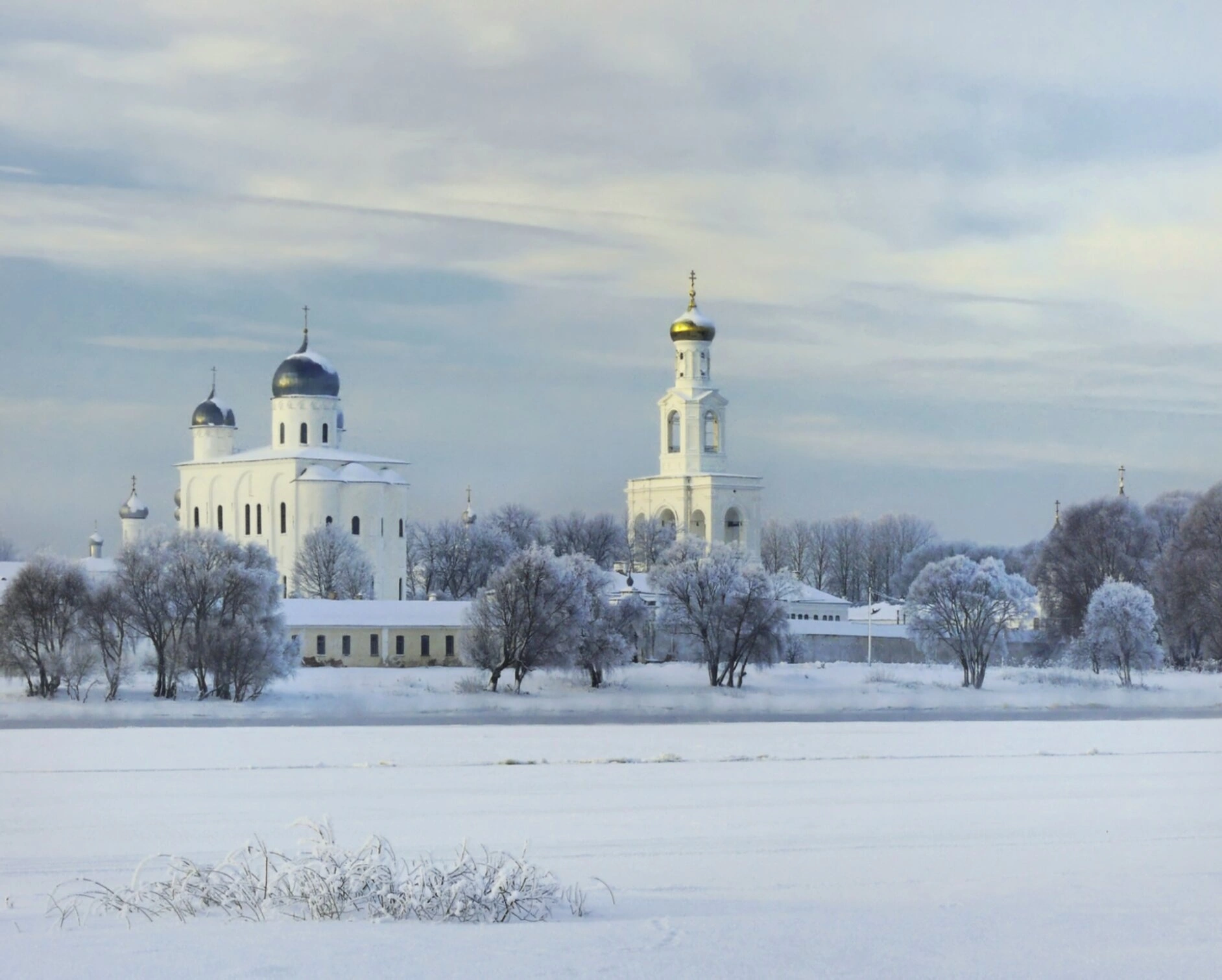 На представленной фотографии запечатлён величественный облик Свято-Юрьева мужского монастыря, одной из древнейших православных обителей России, в умиротворяющий зимний день. Монастырь, основанный в 1030 году великим князем Ярославом Мудрым во имя святого великомученика Георгия Победоносца, располагается на берегу реки Волхов вблизи озера Ильмень.