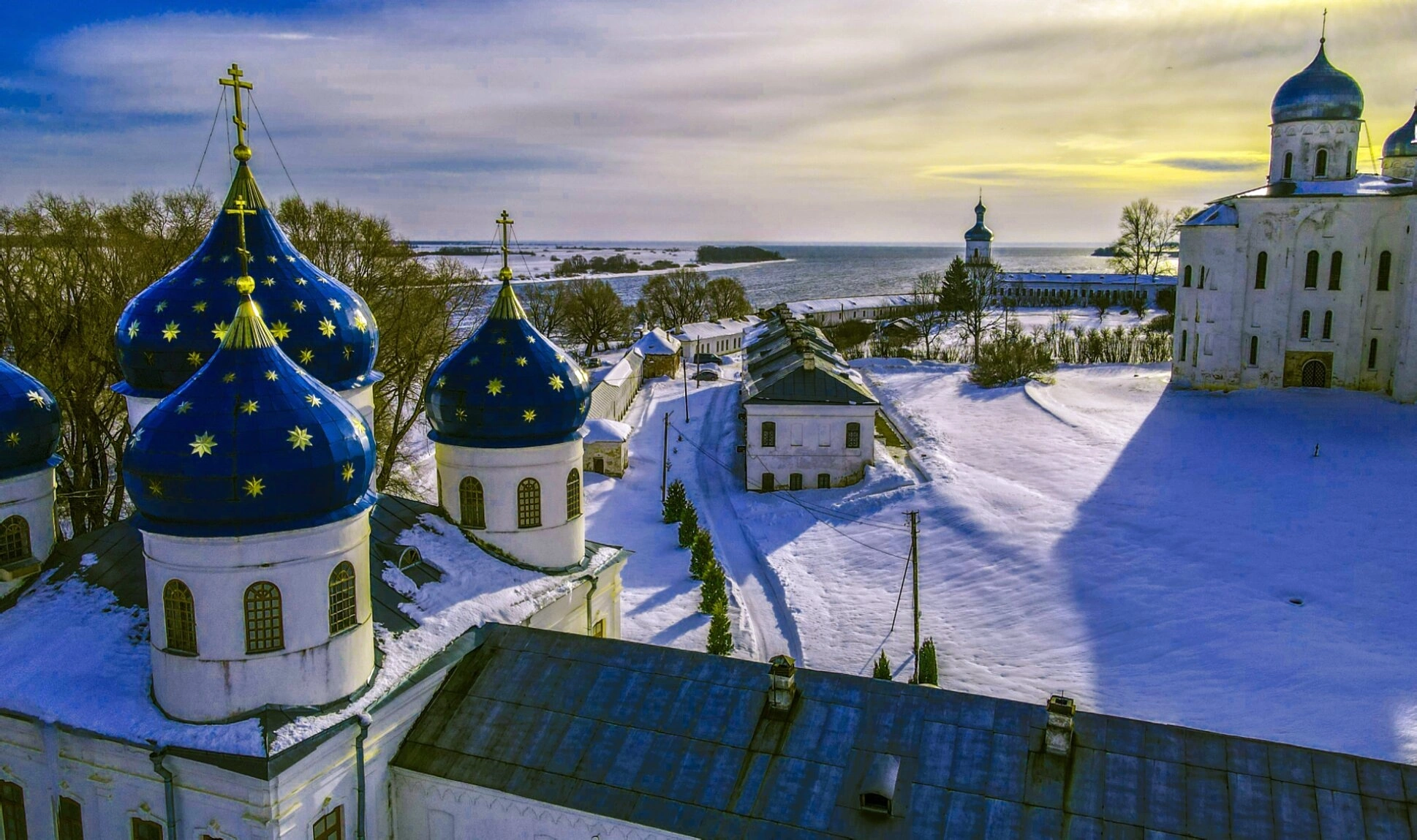 За монастырскими стенами простирается замёрзшая гладь реки Волхов, сливающаяся с горизонтом. Небо, окрашенное в мягкие тона заката, наполняет весь пейзаж тихим, благостным светом, подчёркивая духовную значимость и величие древней обители. Общая композиция фотографии передаёт умиротворённость, торжественную тишину и строгую красоту православной святыни, гармонично вписанной в суровый русский зимний пейзаж.