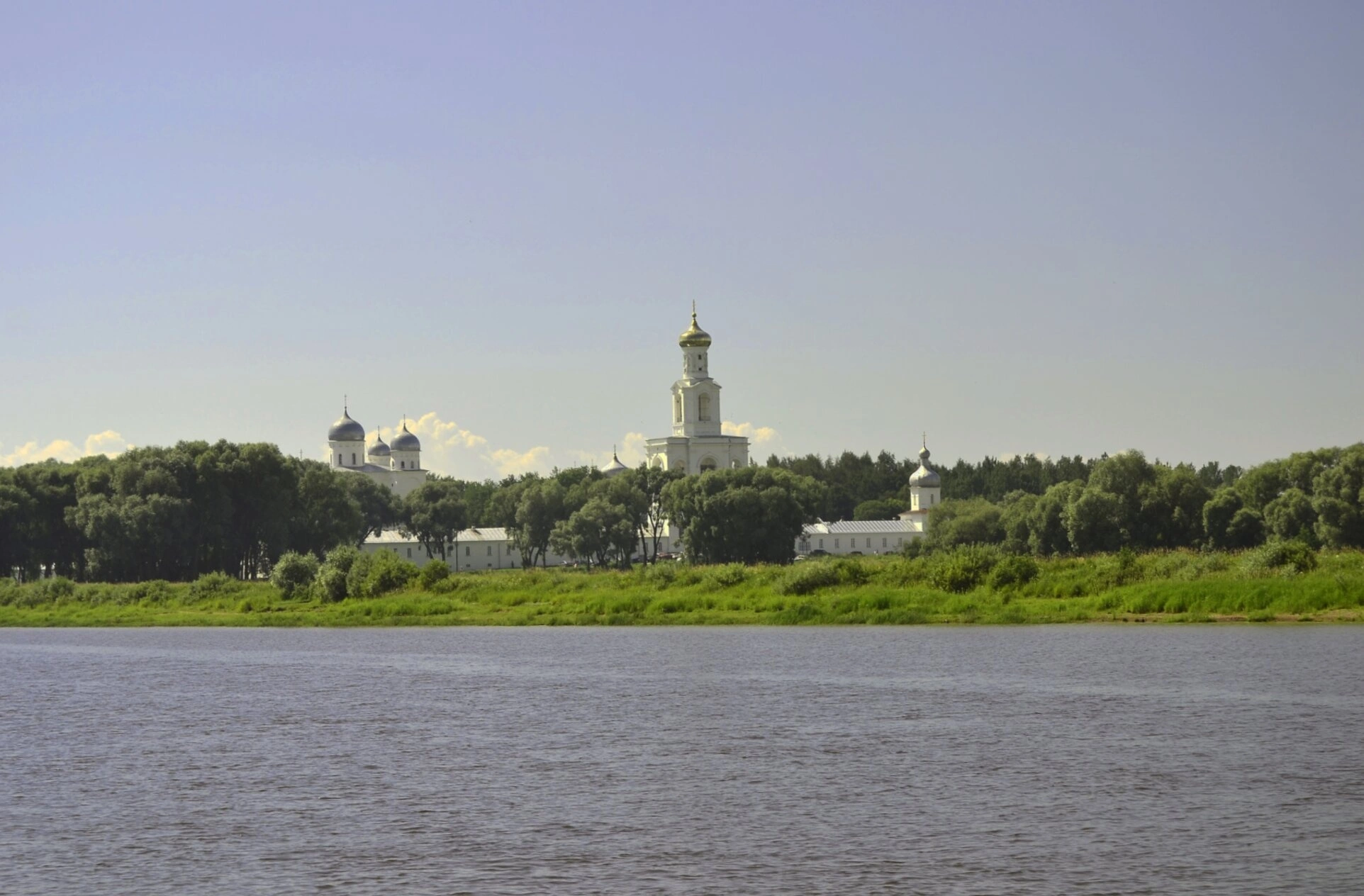 Доминантой архитектурного комплекса, чётко видной на снимке, является величественный Георгиевский собор, сооружённый в 1119 году при благоверном князе Мстиславе Великом. Его строгие и лаконичные формы, увенчанные шлемовидными куполами, являются образцом древнерусского храмового зодчества. Белоснежные стены монастырских построек, колокольня и окружающий ландшафт создают образ небесного града, гармонично вписанного в приирменский пейзаж. На протяжении своей многовековой истории монастырь был не только духовным центром, но и усыпальницей новгородских князей, а также крупным феодальным владельцем. Ныне в возрождённой обители продолжается иноческая жизнь, привлекающая паломников со всей России своими святынями и благодатной молитвенной атмосферой.