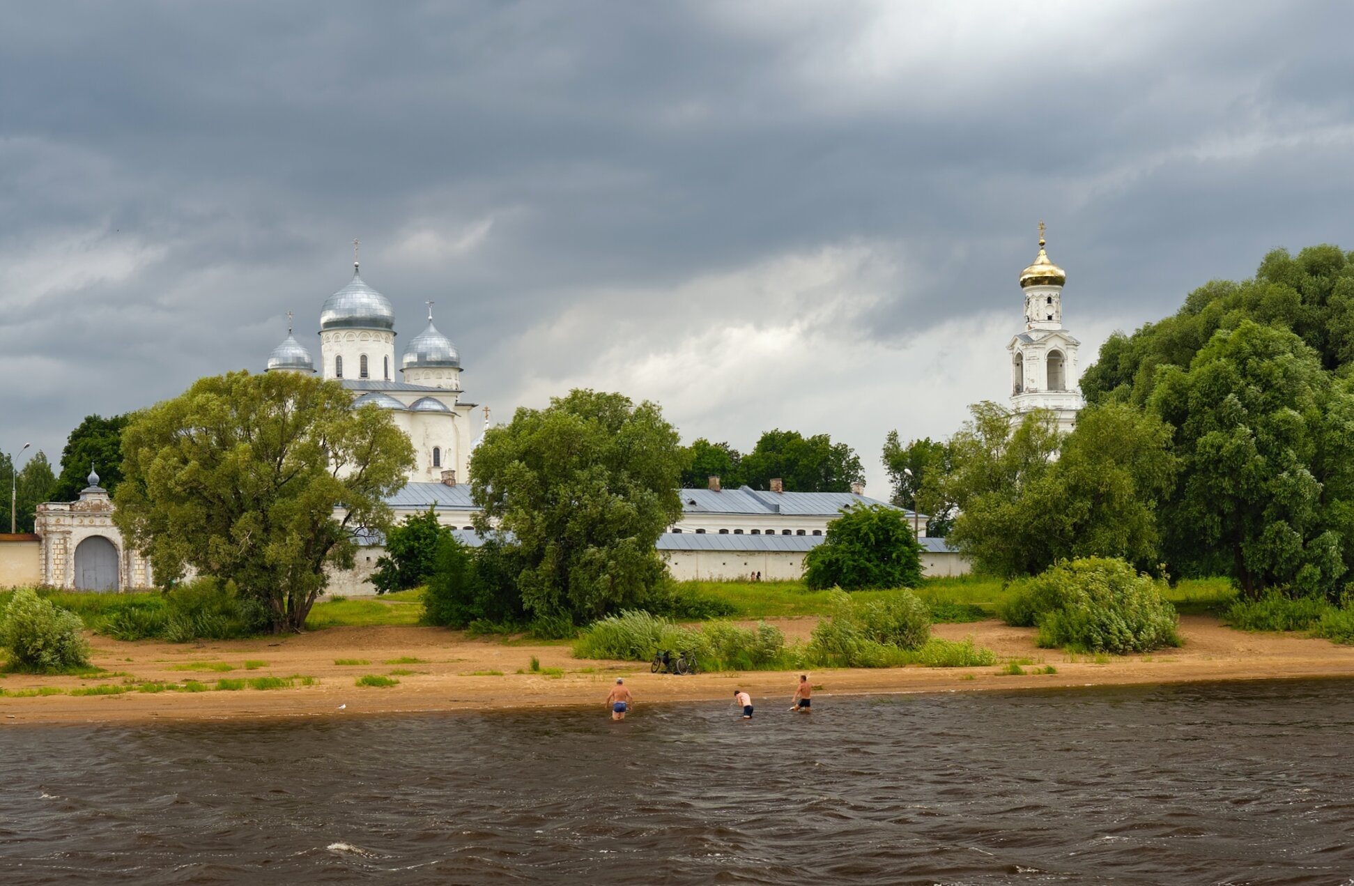 На переднем плане изображения видна спокойная гладь реки Волхов, являющейся одной из ключевых водных артерий Новгородской земли. Неширокий песчаный берег и пологий спуок к воде подчёркивают естественную красоту этого места. На дальнем плане, во всём своём духовном величии, возвышается монастырский комплекс с его белоснежными стенами, устремлёнными в небо златоглавыми куполами и высокой колокольней.