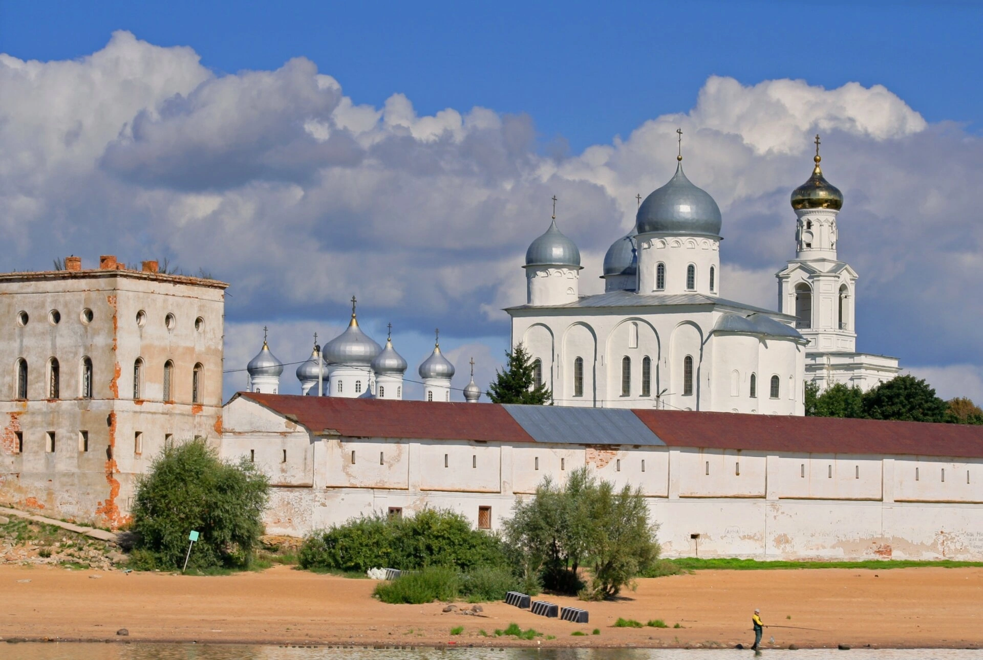 На фотографии запечатлён величественный вид на Свято-Юрьев мужской монастырь со стороны реки Волхов. Этот древнейший православный монастырь Новгородской земли, основанный великим князем Ярославом Мудрым во имя святого великомученика Георгия Победоносца, является одной из главных духовных святынь России. Центральное место в композиции снимка занимает белоснежный Георгиевский собор, увенчанный сияющими на солнце златоглавыми куполами.