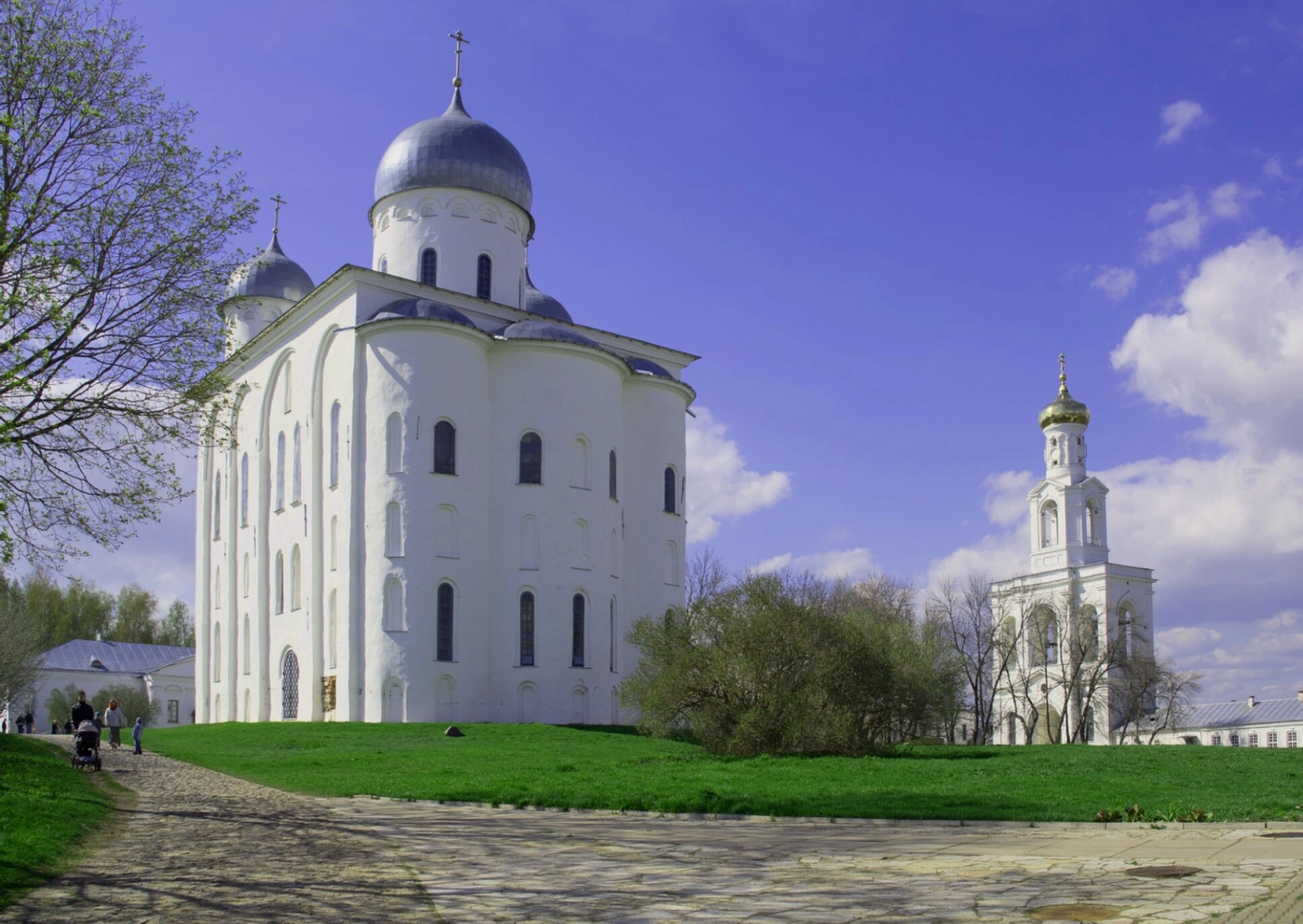 Монастырский комплекс окружен ухоженной территорией с зелёными лужайками и тенистыми деревьями, что придает ему особый, умиротворяющий вид. Ясное небо с легкими облаками и мягкий солнечный свет, запечатленные на снимке, подчеркивают благодатную атмосферу этого намоленного места, освященного веками монашеского подвига и молитвы. Юрьев монастырь, являющийся объектом всемирного наследия ЮНЕСКО, продолжает оставаться действующей монашеской обителью и привлекает множество паломников, seekingющих поклониться его святыням и прикоснуться к славной истории русского православия.