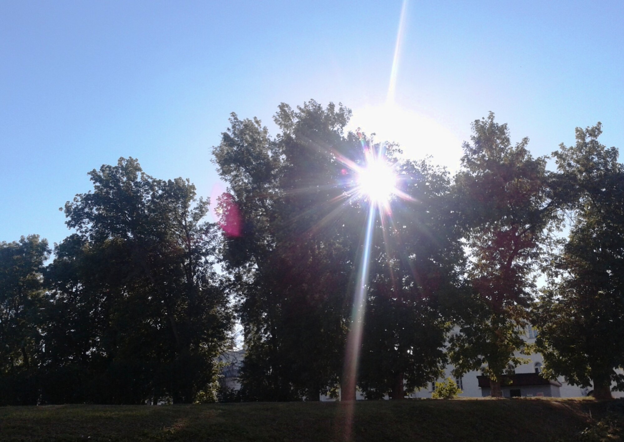 На фотографии запечатлён величественный вид Свято-Юрьева мужского монастыря, одной из древнейших православных обителей России, освещённый лучами летнего солнца. Яркий свет, пробивающийся сквозь ветви деревьев, символически озаряет святые стены, создавая божественное сияние и подчёркивая духовную значимость этого места. Монастырь, расположенный на возвышенном берегу реки Волхов, предстаёт в ореоле благодати и вечности.
