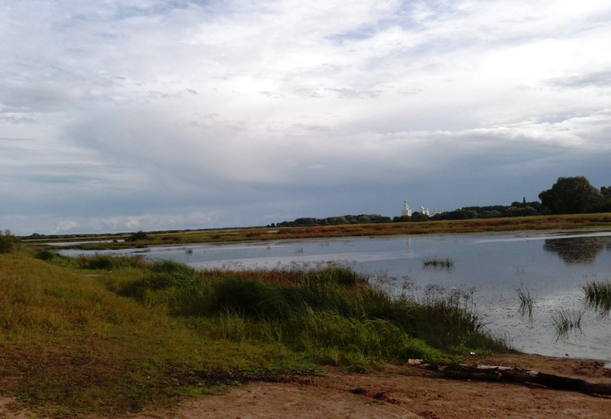 На фотографии запечатлён величественный вид на Свято-Юрьев мужской монастырь, одну из древнейших православных обителей России, с берега реки Волхов. Монастырь, основанный в 1030 году великим князем Ярославом Мудрым во имя святого великомученика Георгия Победоносца, является духовным символом Новгородской земли и выдающимся памятником древнерусского зодчества.